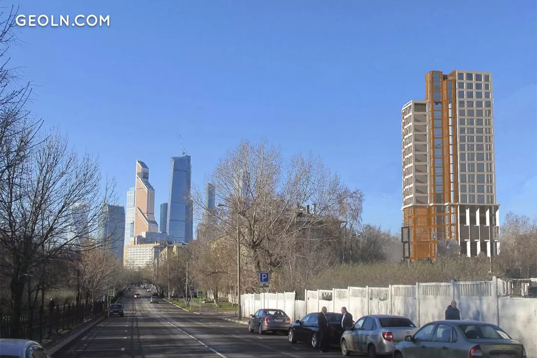 住宅区“ Presnya的领导者”采用梯田建筑,外墙采用大型玻璃幕墙,并具有明显的建构主义风格。
