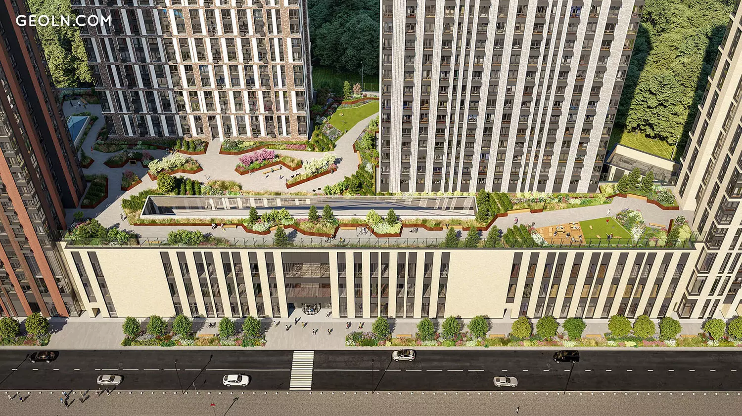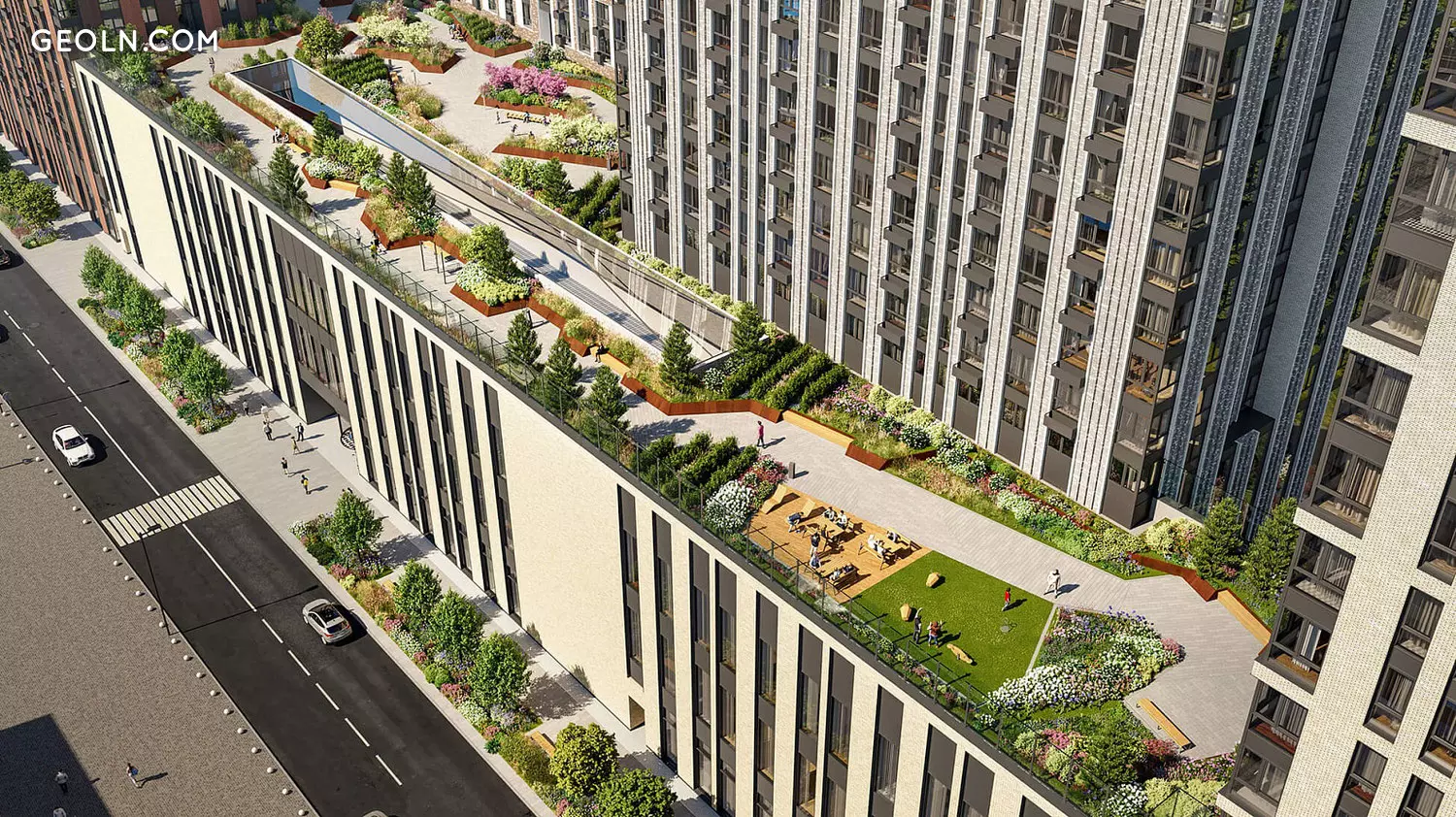 游乐区,运动场和游乐场,夏季凉廊和咖啡馆将位于花茎的被开发屋顶上,只有新建筑的居民才能进入。