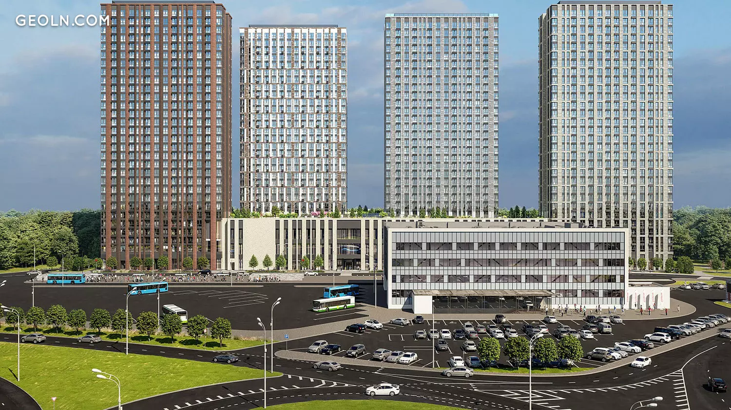 住宅区“探索公园”-由几座高层建筑组成的街区,以相同的风格装饰,被公园区所环绕。