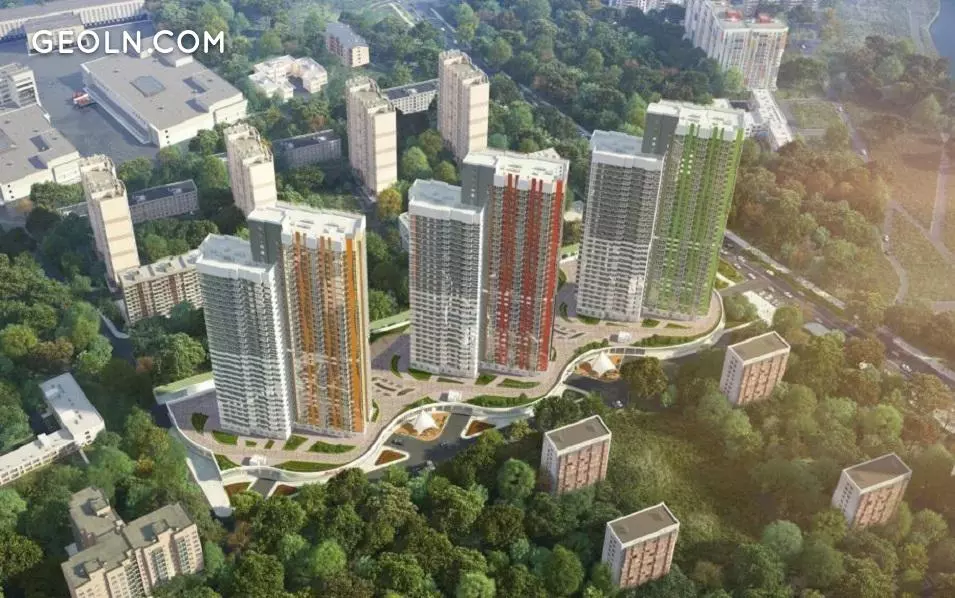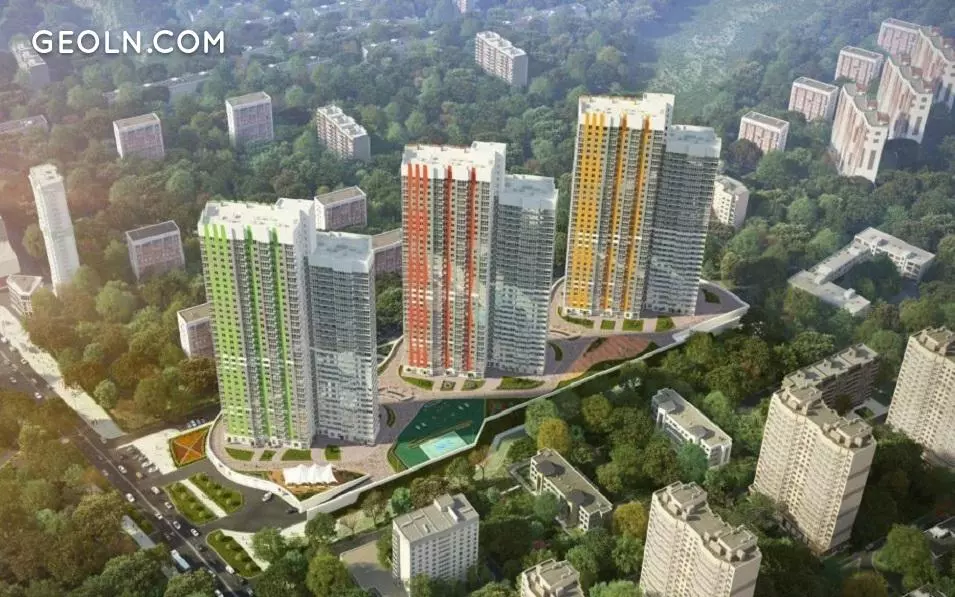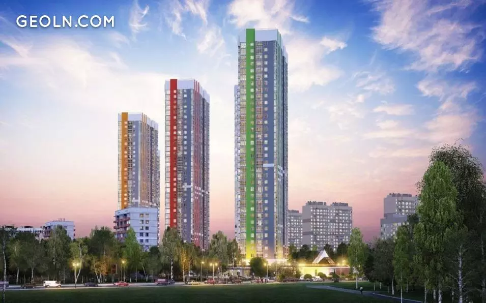 RC“节日公园”(17-19号楼)由三座两部分的建筑物组成,高度为38层。这些房屋以相同的风格设计,并位于两层楼的风格房中。建筑物的屋顶平整。