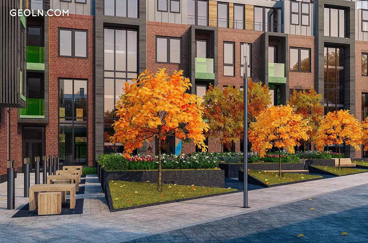 在一楼有零售和办公场所。房屋之间布置了铺有铺路砖的路径和车道。已安装路灯。