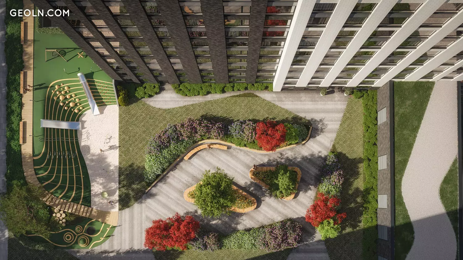 在没有汽车的封闭庭院,设有橡胶和沙子表面的运动场,设有健身器材的运动区和网球桌。绿化将根据景观设计项目进行。地下停车场出售98个停车位和64个独立的储藏室。