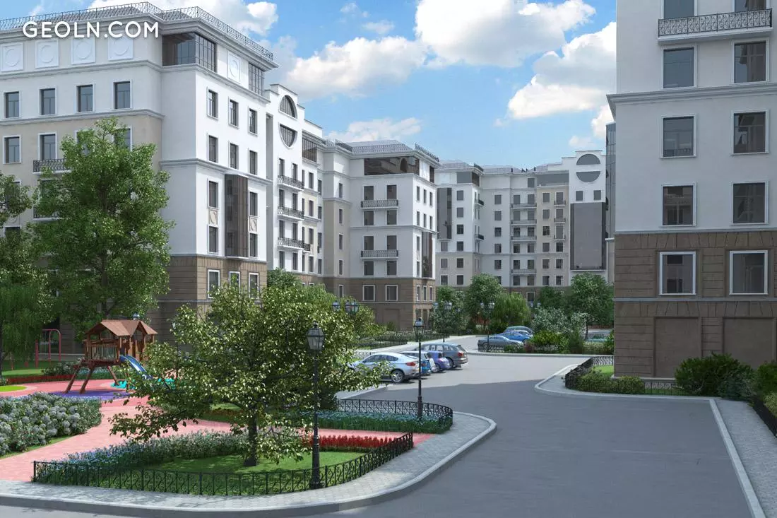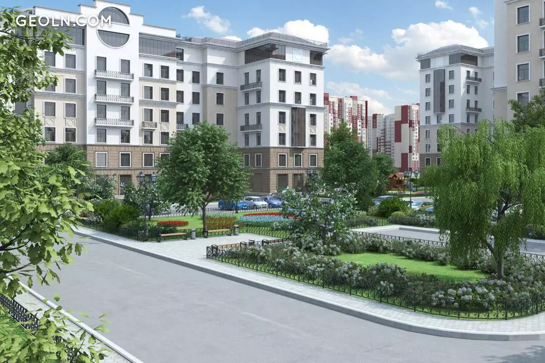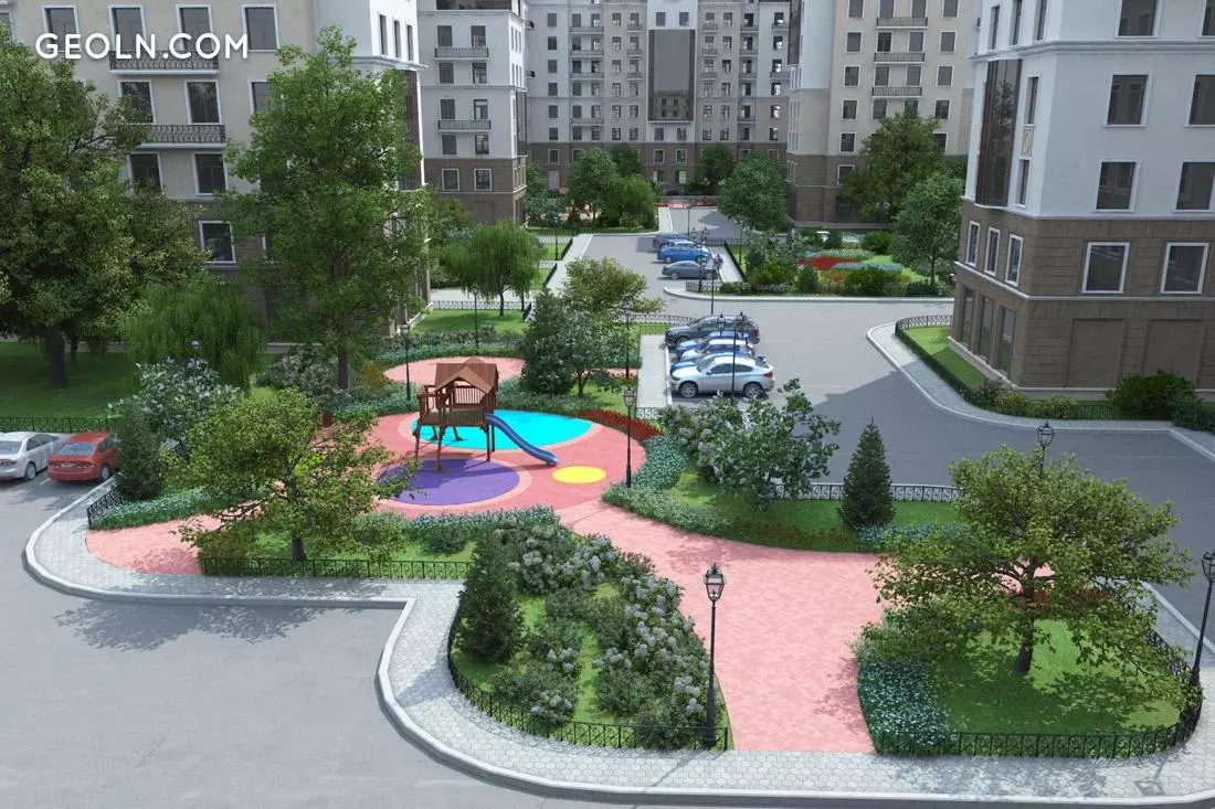 新建筑的庭院和相邻区域均已美化。铺设草坪,花坛,种植树木和灌木。有设备齐全的儿童游乐场。保留进行体育运动的地方。住宅区的人行道和行人路均涂有沥青。