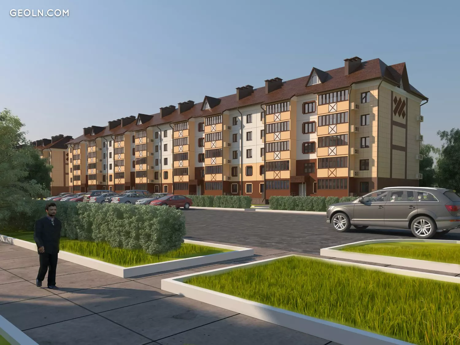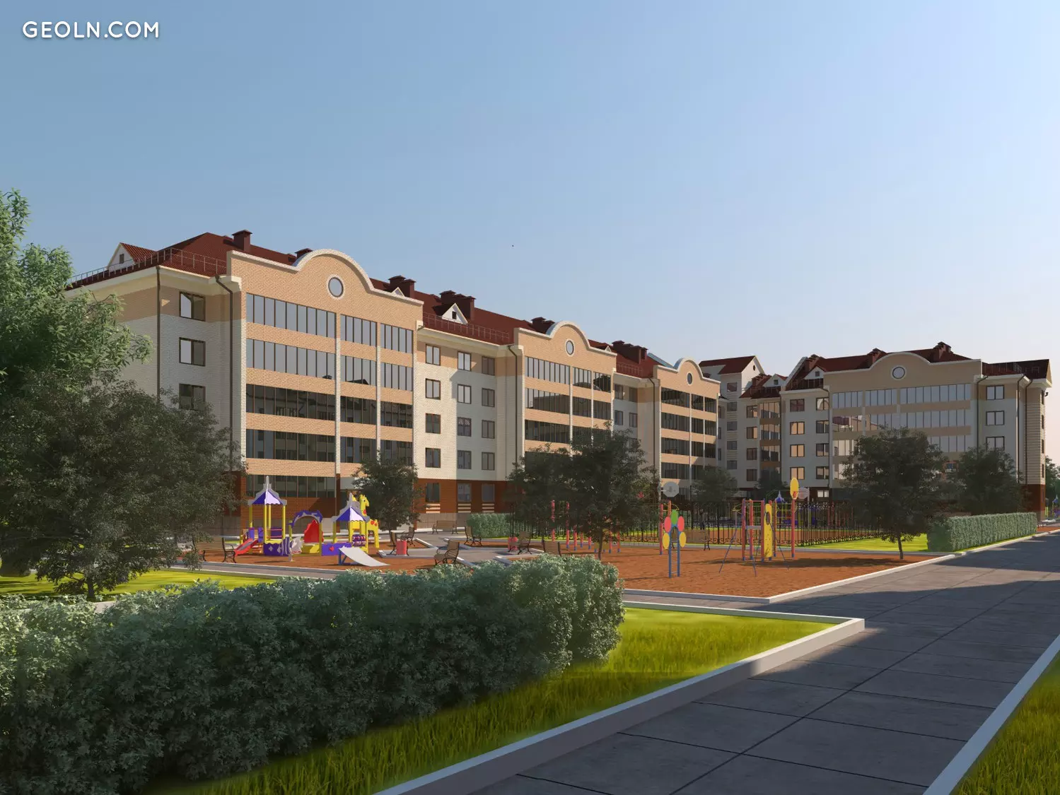 该发展计划规定了学校和幼儿园,车库和停车位的建设。庭院正在开发中,正在美化环境。正在建设体育和儿童游乐场。入口道路正在涂柏油,道路沿建筑群的领土铺设。