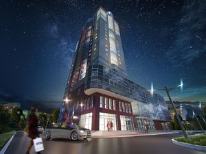 新建筑是一个四部分,二十二层的房子,建在宽敞的柱状花序上,应该用作相邻的区域。