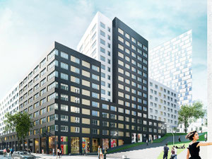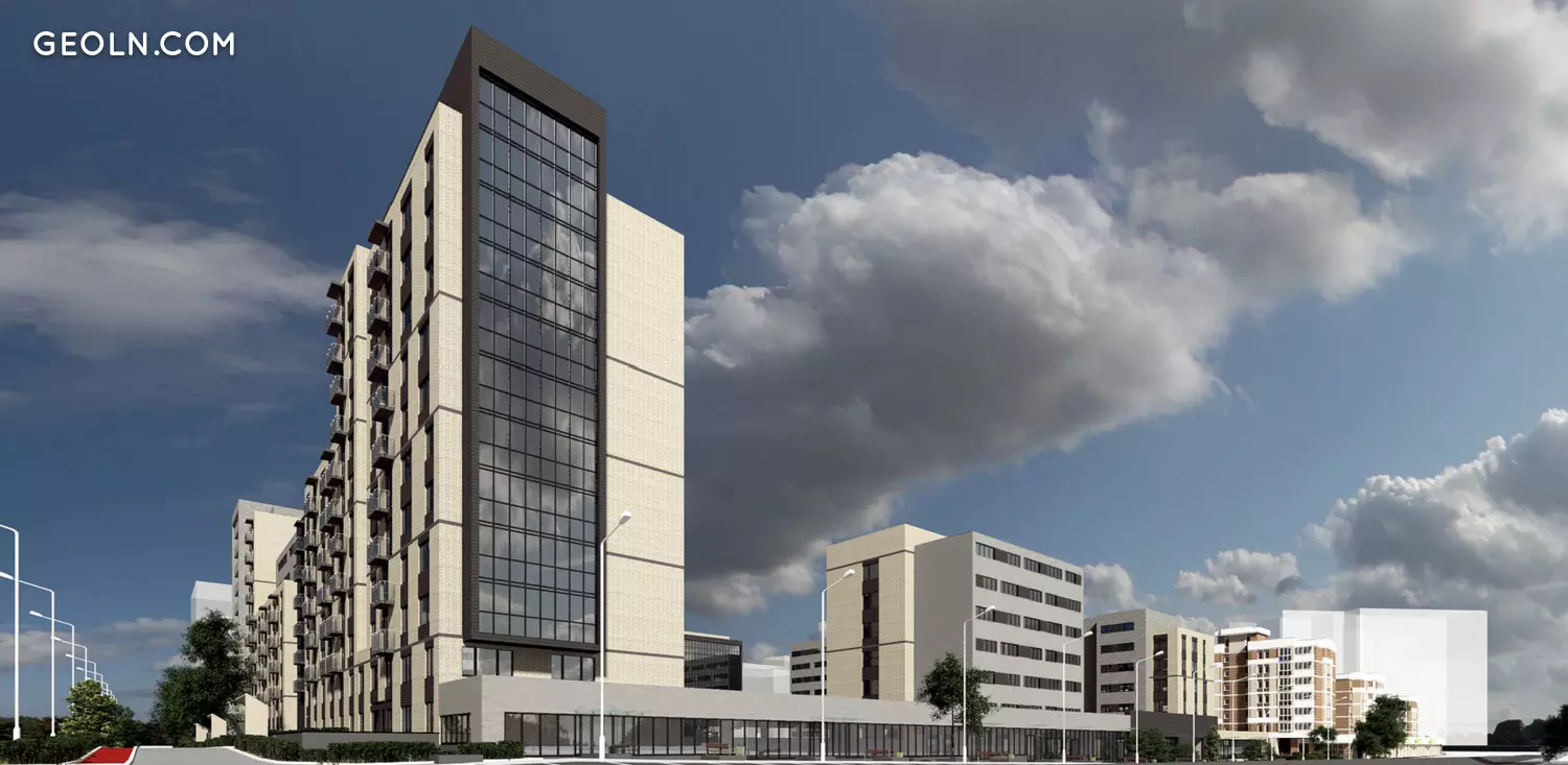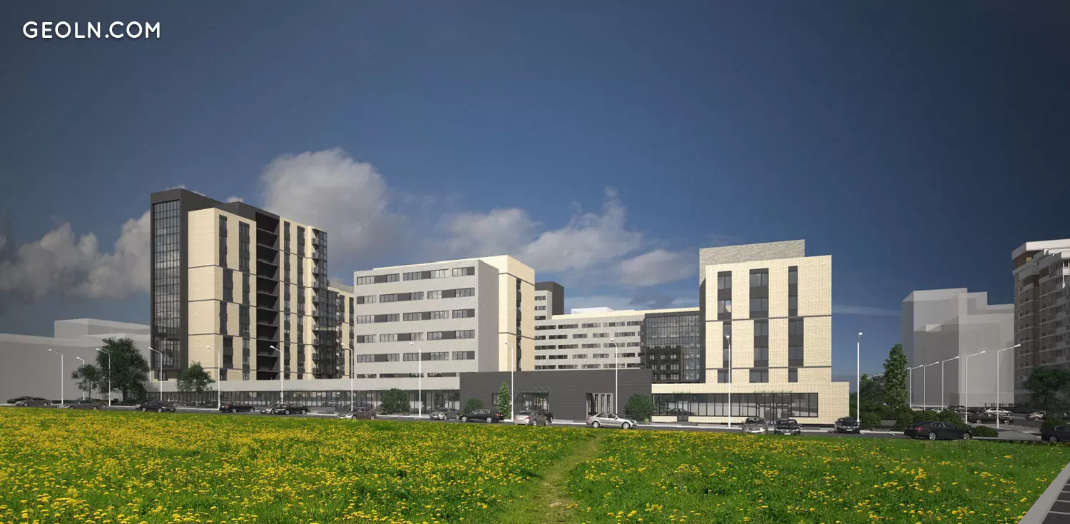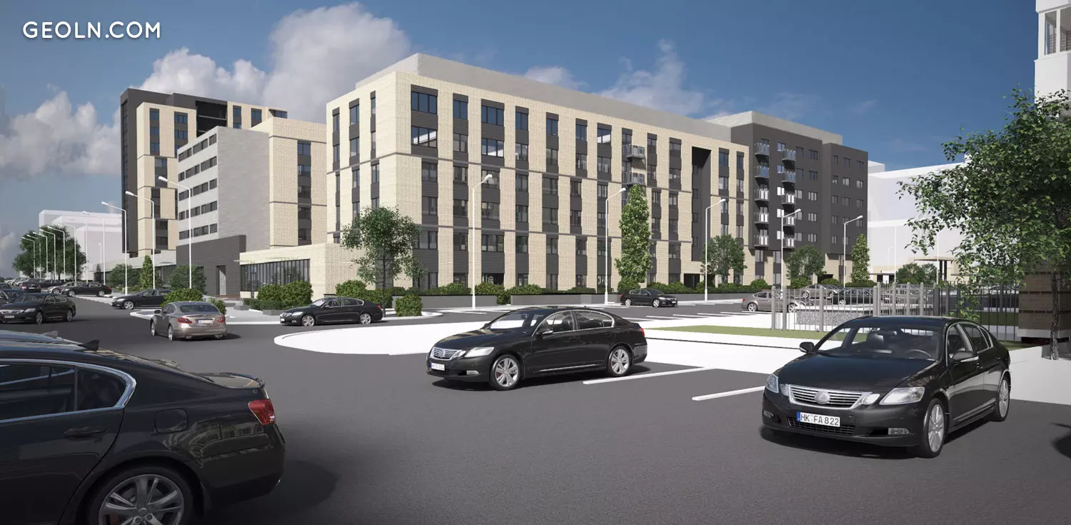 新建筑是一栋11层的整体框架房屋,高度为6至11层。建筑群的各个部分形成了一个四边封闭的庭院。