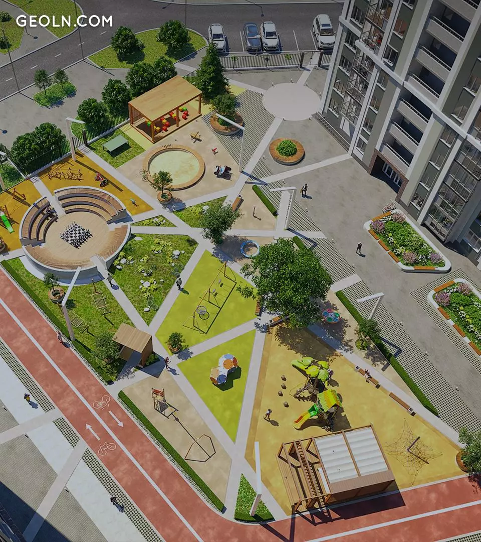 入口为婴儿车提供了空间,以及存放淡季物品。综合大楼的内部区域禁止车辆通行。设计文档计划对庭院,休闲区,进行各种运动的游乐场,人行道和儿童游乐场进行美化。为了方便车主,配备了多层地下停车场和宾客停车场。