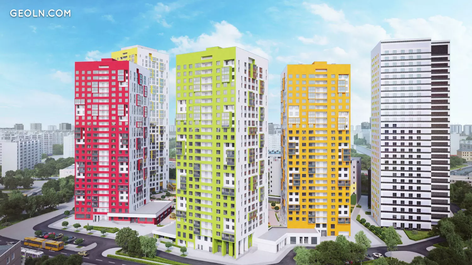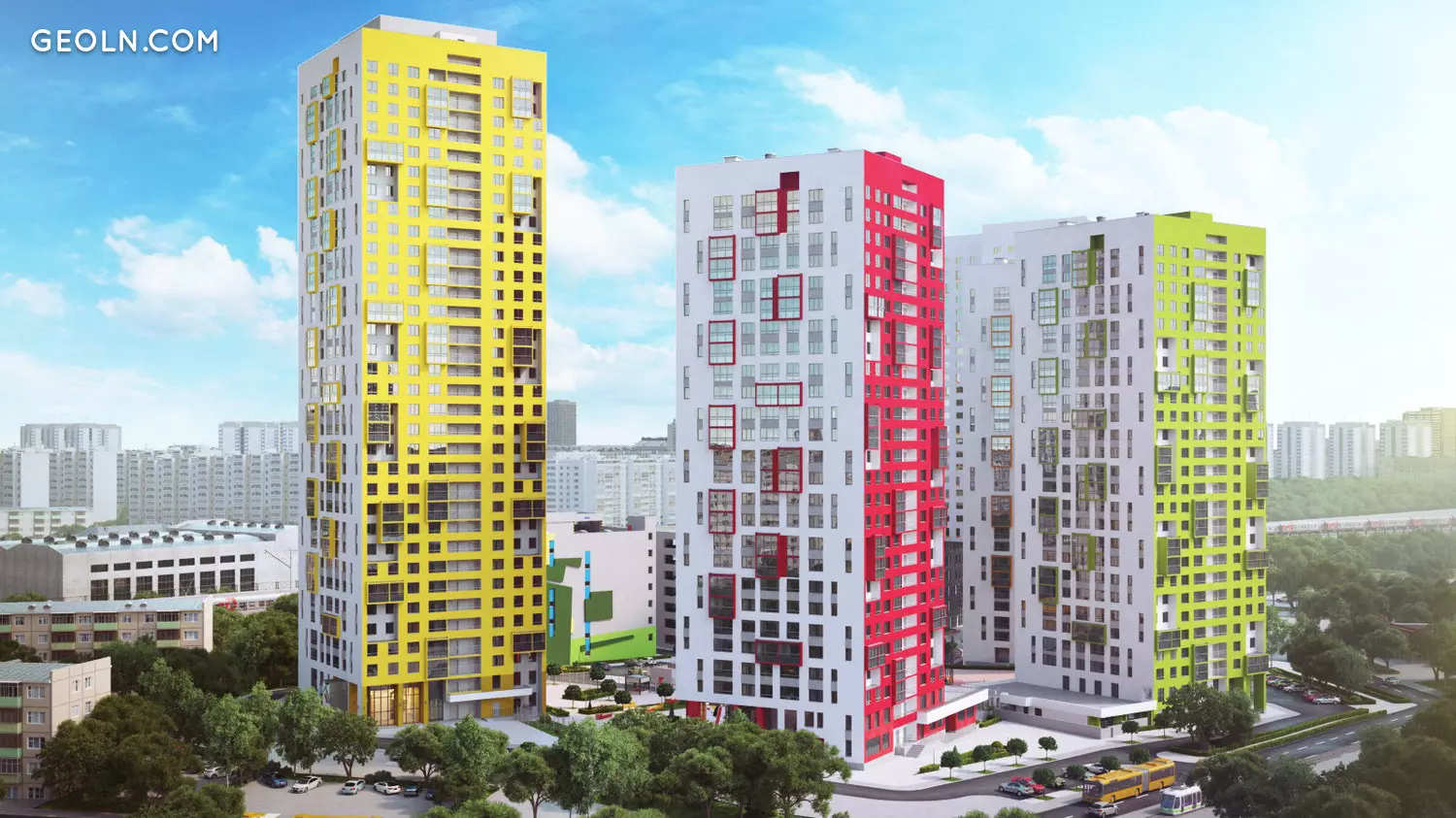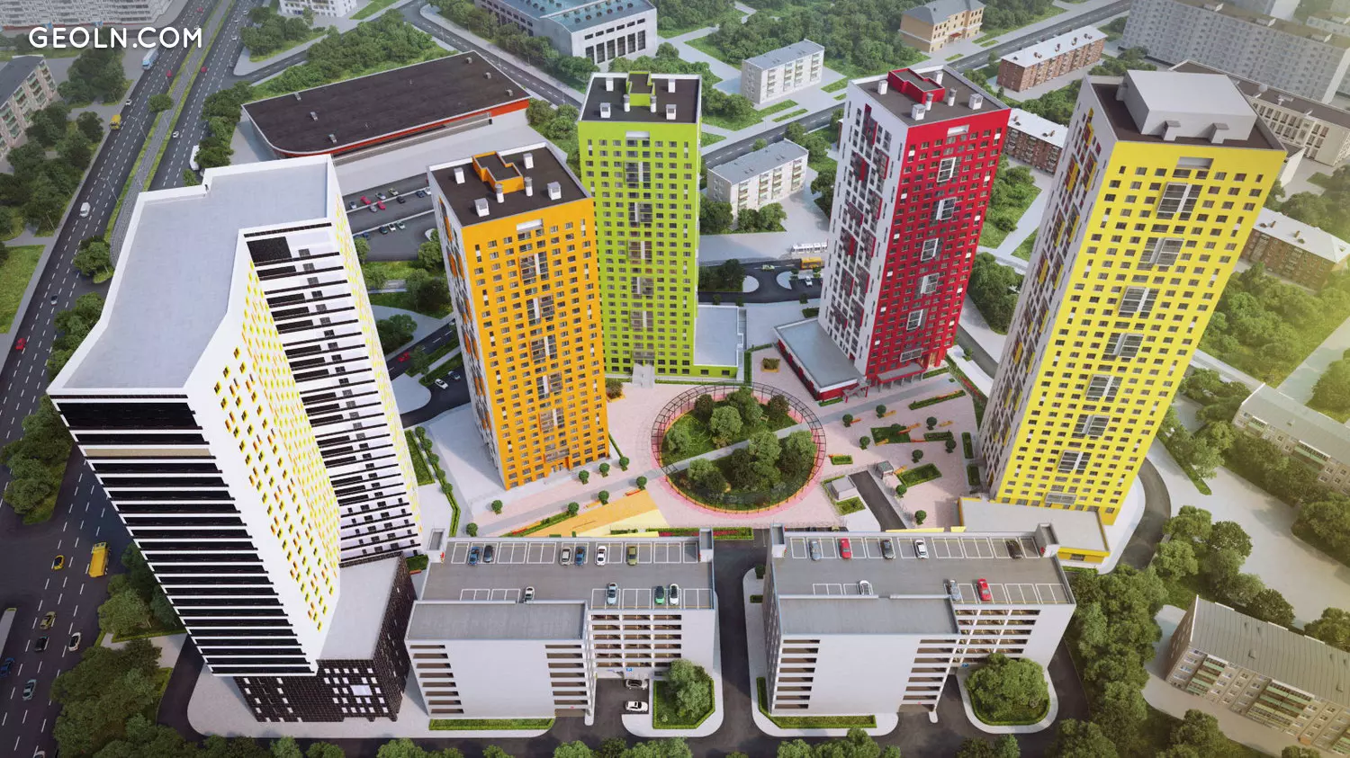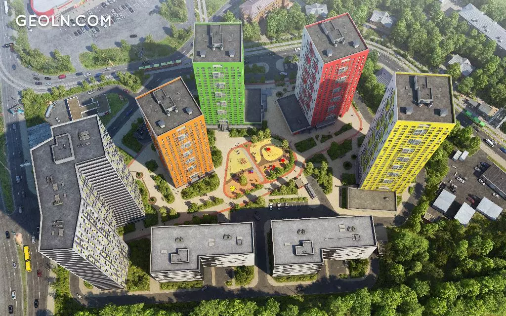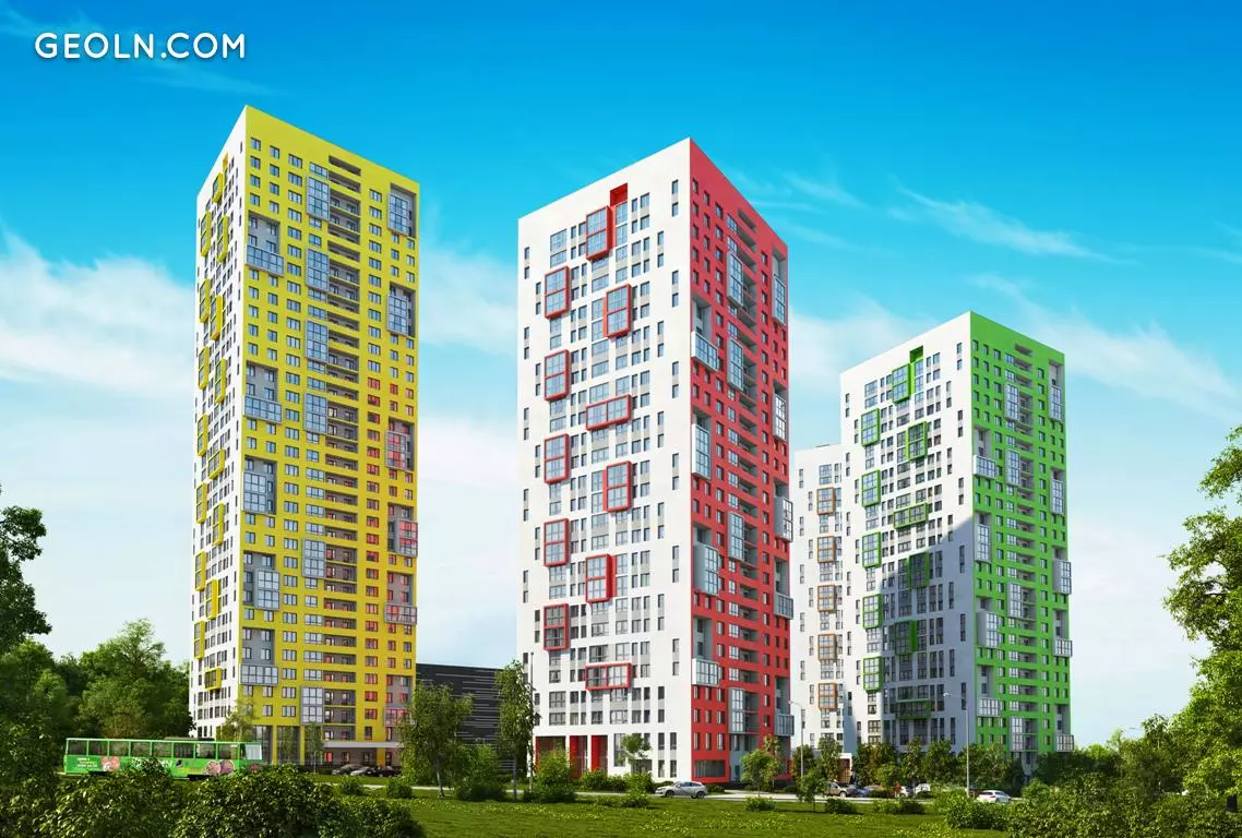 住宅区“ Malevich”是一个小型的新街区,由高层时尚建筑组成,其外墙涂有鲜艳的色彩。