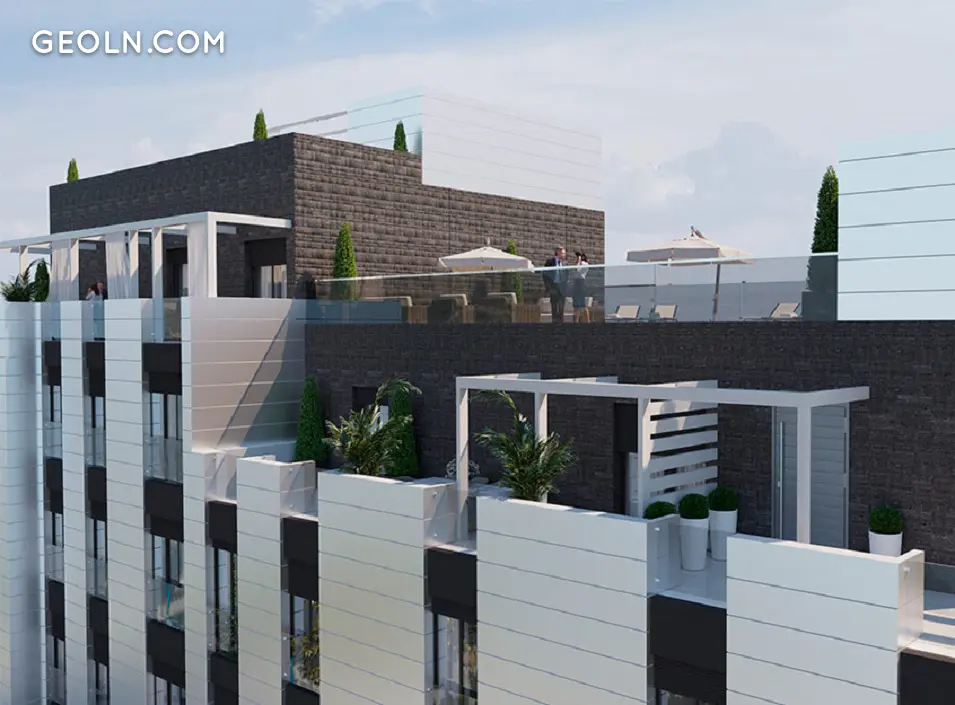 它包括一组带有1、2、3和4间卧室的不同类型的房屋,设有停车位,日光浴室和屋顶上的水疗区供社区使用,这将为其居民提供放松身心并欣赏令人惊叹的全景的空间马德里的屋顶。