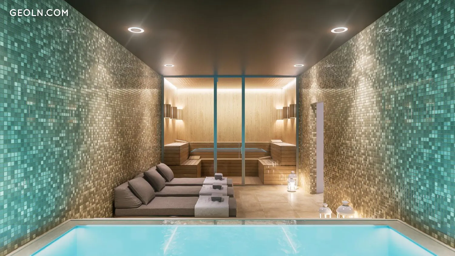 它有一个120平方米的无边泳池,配有夜灯和盐氯化法。