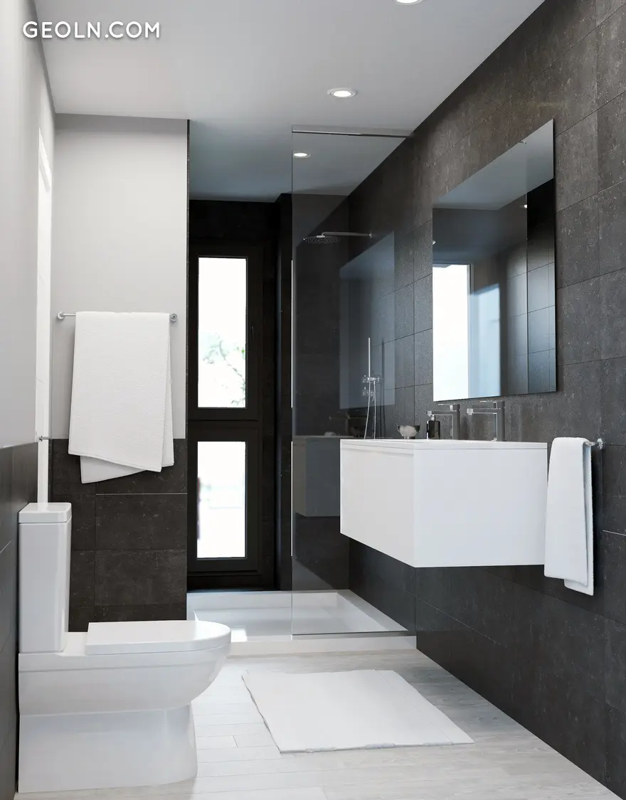 主浴室,白色马桶;带有恒温龙头的额外平板淋浴盘;以及带家具和单把水龙头的内置洗脸池。