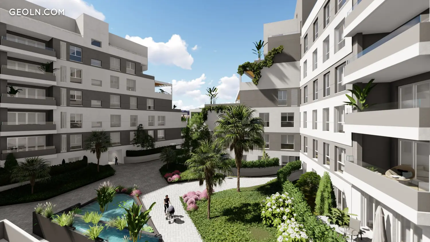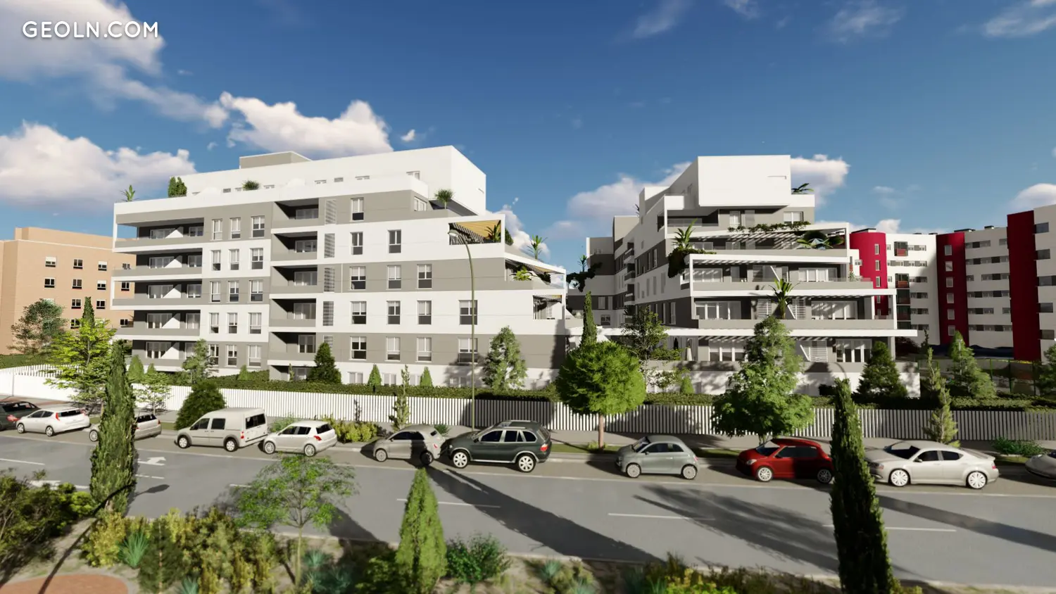 96户房屋设有2、3和4间卧室,大露台,壮观的顶层公寓和带花园的地面层,均设有1或2个停车位和一个储藏室。