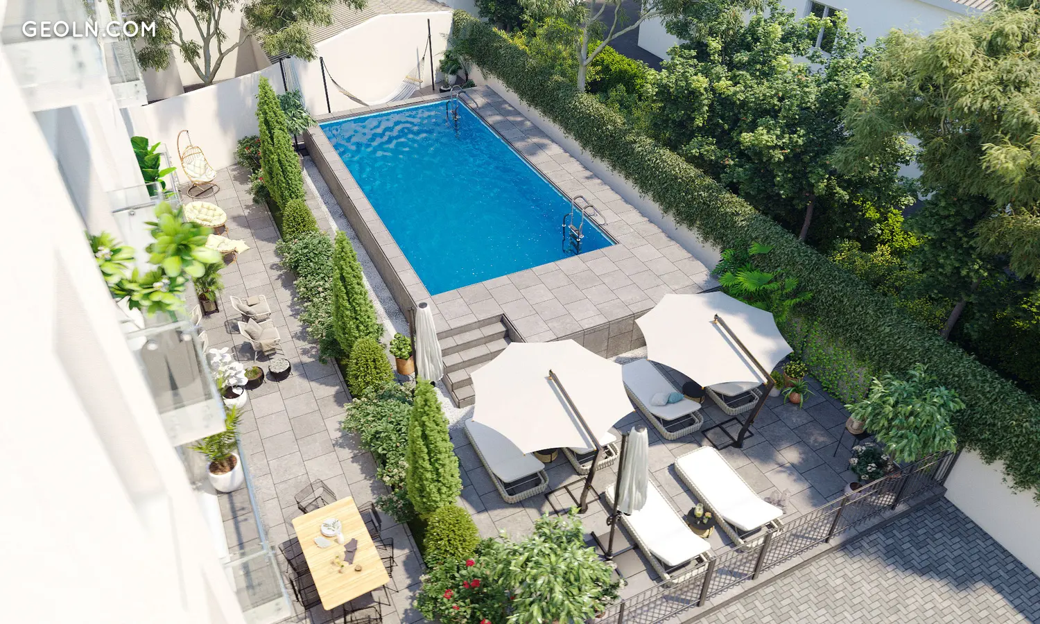 特权城市化,带游泳池,电梯和带露台的房屋。