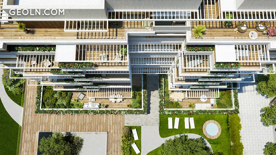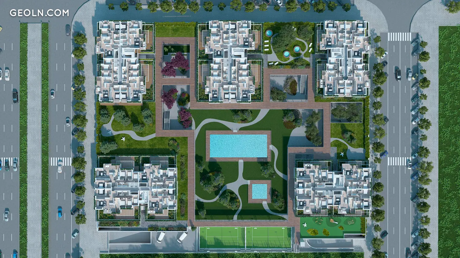 这个有2个,3个和4个卧室的住房项目被安排在八个高度的五个块中,这五个内部块定义了一个内部区域,该区域的公共区域分布在两层楼上,并且景观美化了耗水量低的植物,从而极大地促进了独特性。健身房,社区室,成人和儿童游泳池,两个板球场和儿童游乐区定义了这个引人入胜的私人城市化进程,在城市化进程的入口处设有护栏,用于出入控制。在底楼,安排了一套商业场所,可以从外面进入,保持了城市化的私密性。以及被窗户包围的开放式空间的前卫办公室,使光线成为主要主角。上层公共区域被人行道包围,可以更好地进行内部沟通,并享有下层公共区域的美景,该区域的三个室外水流按摩浴缸插入一个放松的室外植物环境。