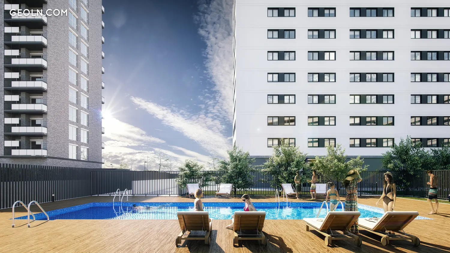 它有一个公共游泳池,花园,游乐场,板球场,健身房和社交俱乐部。俯瞰艺术与科学城,西面是托里亚花园,东面是大海。