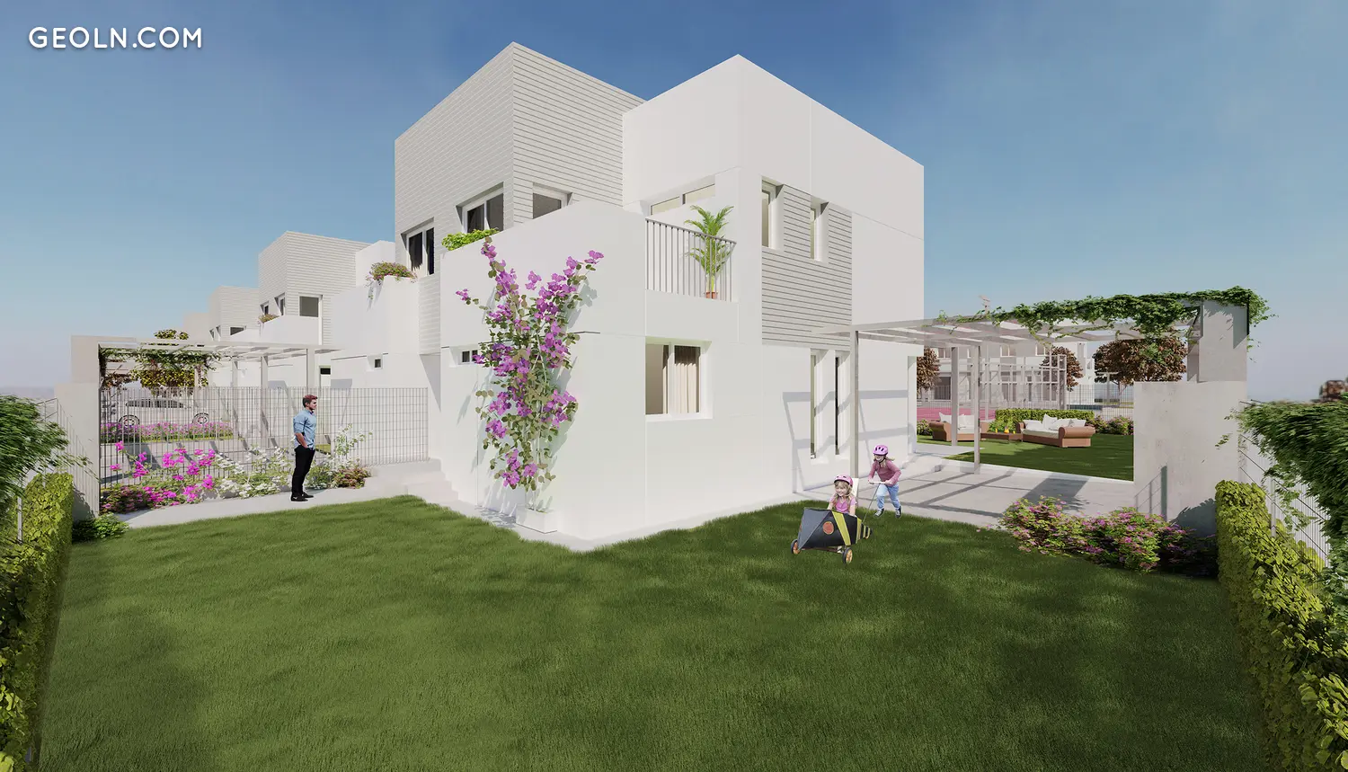 促销24个半独立式和半独立式房屋,这些房屋有2层,设有大客厅和厨房,4间卧室,3个浴室,露台,花园和两辆车的停车位。