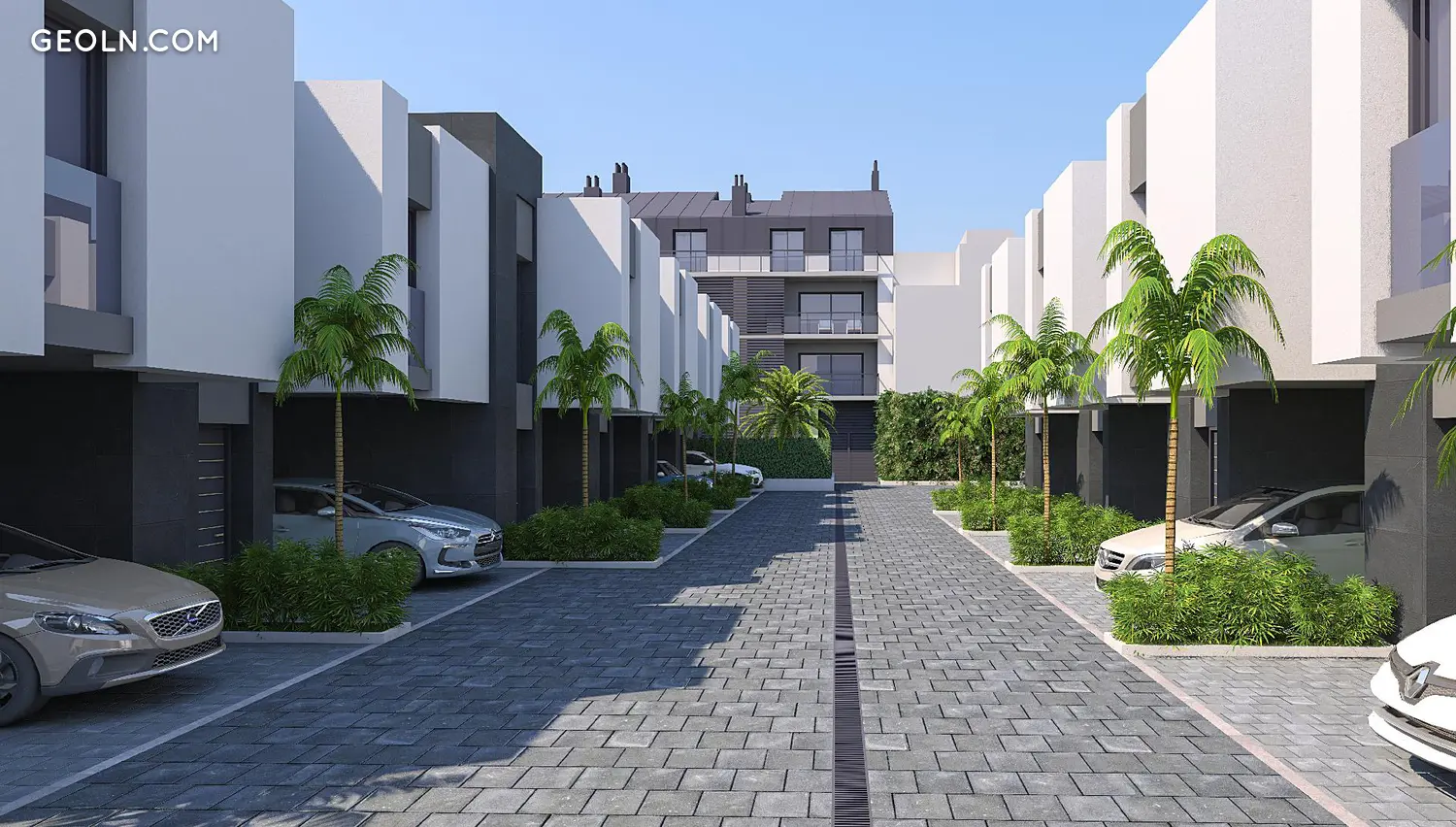13排两排联排别墅,一条内部道路可通往通往住宅区前面停车位的道路。