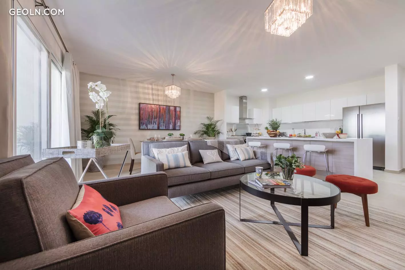您可以选择有1间卧室(778平方英尺起),2间(1369平方英尺起),3间(1807平方英尺起)或4间(2337平方英尺起)的公寓。所有内饰均采用当代欧洲风格设计。