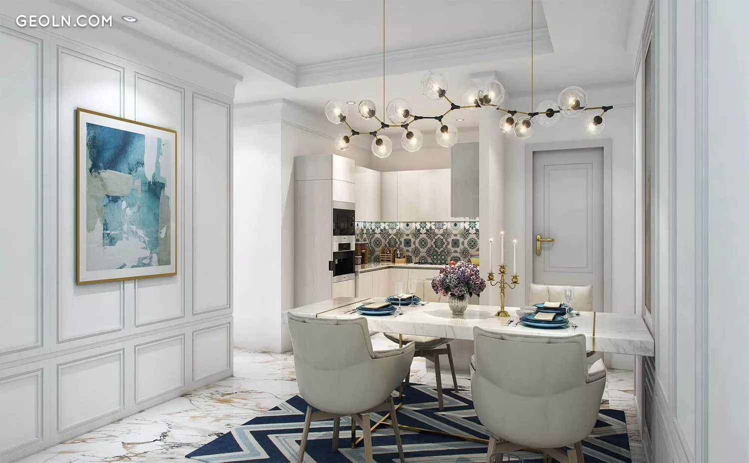 共有563套设施齐全的公寓,拥有豪华的室内设计,大小不一,从一室公寓到四卧室单位。绚丽的光泽地板和点射照明的雪白压花天花板与优质木制家具完美结合。现代美丽的厨房用具包含高品质的电器。浅米色饰面的浴室配有大浴缸,洗脸池和橱柜。一室公寓设有一间浴室。在其余的公寓中,浴室的数量相当于卧室的数量加上宾客卫生间的数量。
