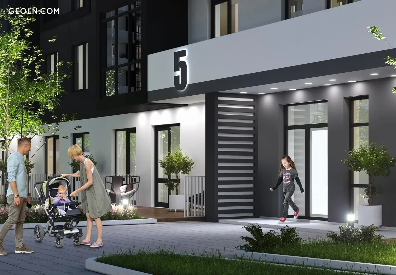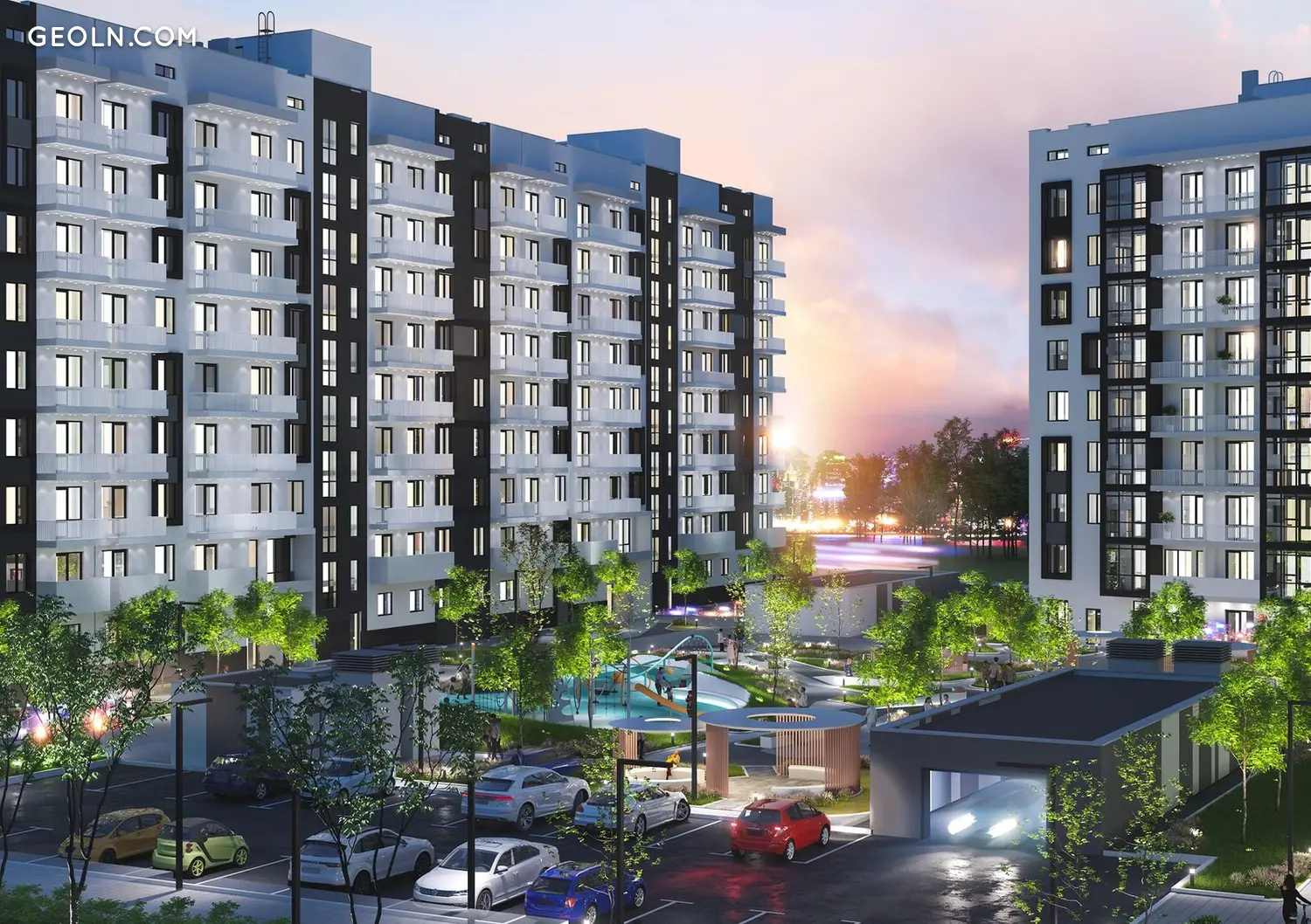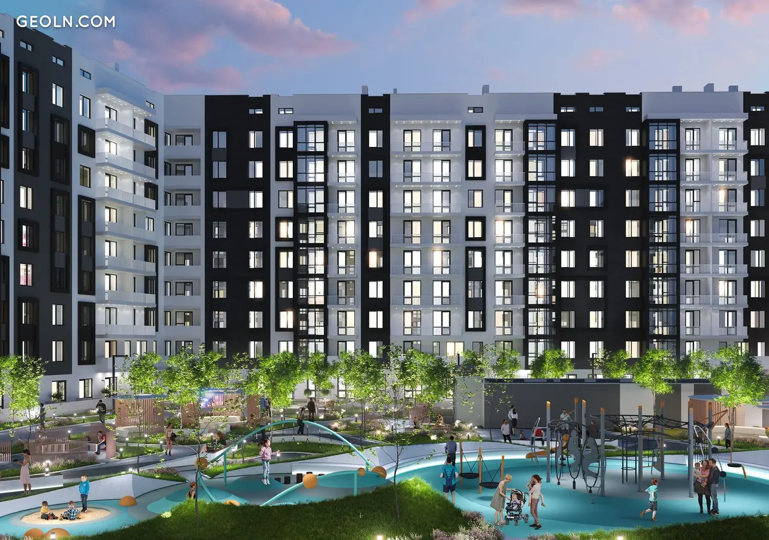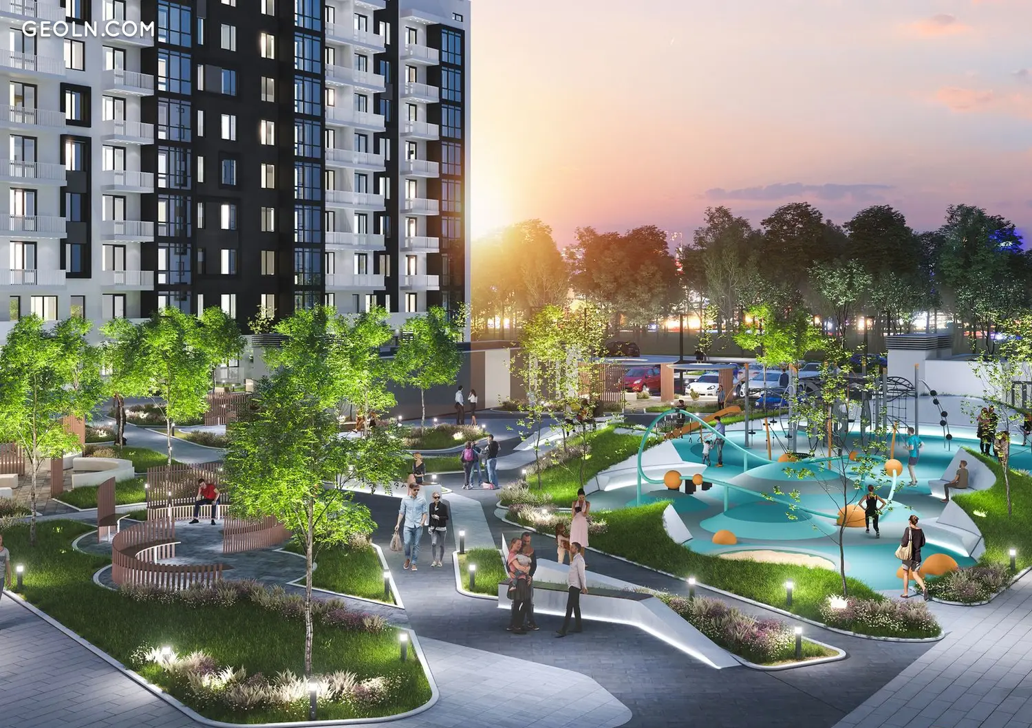 相邻区域的布置项目为不同年龄段的人群提供了现代化的互动游乐场和运动场、户外休闲凉亭、带花坛的绿岛、步行街。房子的下层留出商业空间,将容纳咖啡馆、各种方向的商店、美容院和其他服务。为了让有车的住户和院子里的客人感到舒适,这里有一个可停放 100 辆车的多层地上停车场,屋顶有一个篮球场,还有一个开放式停车场。