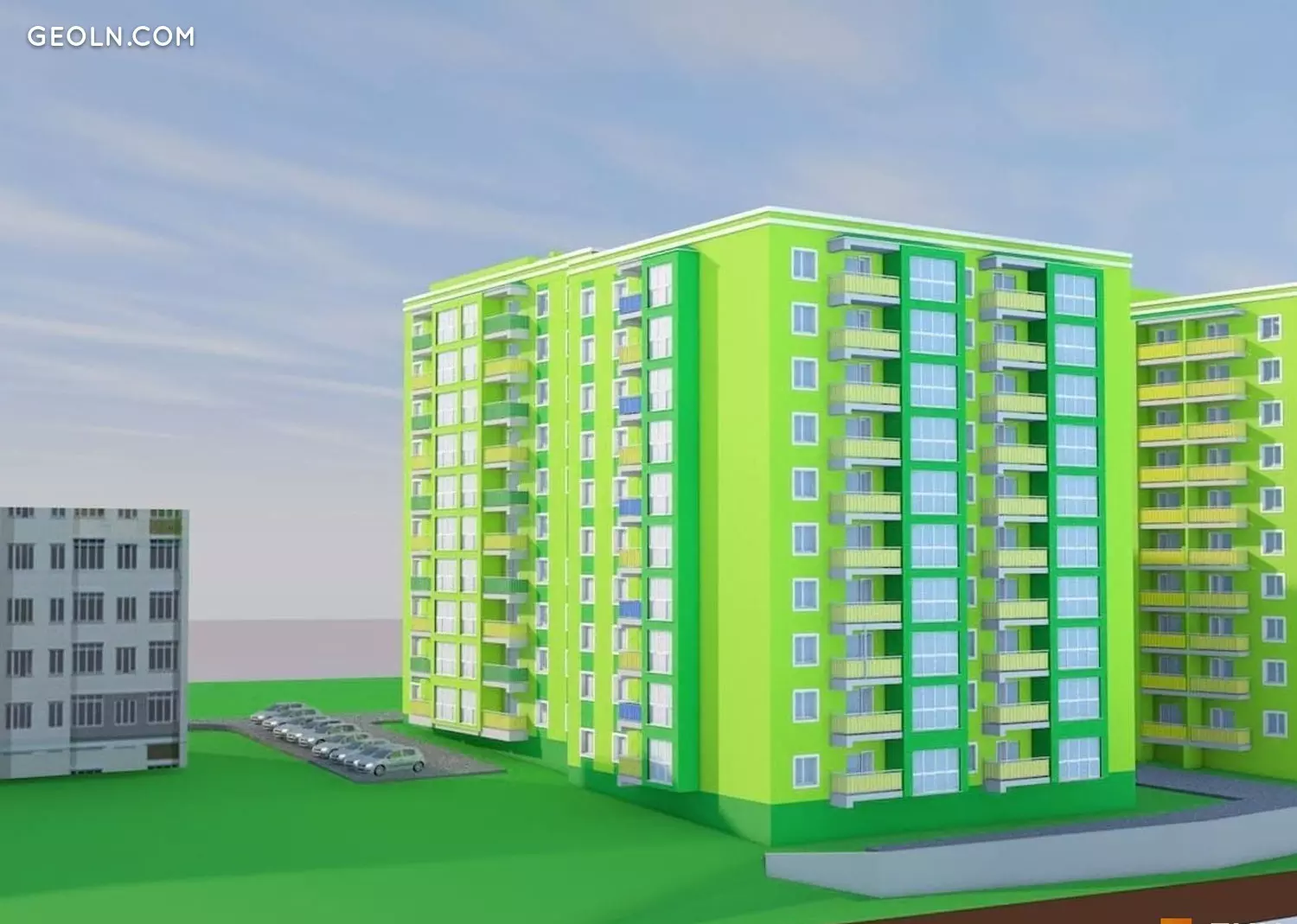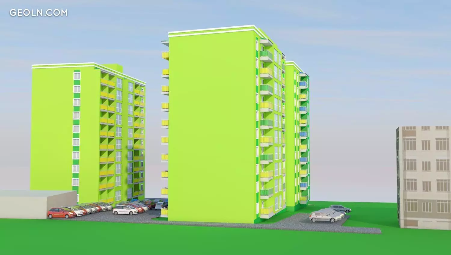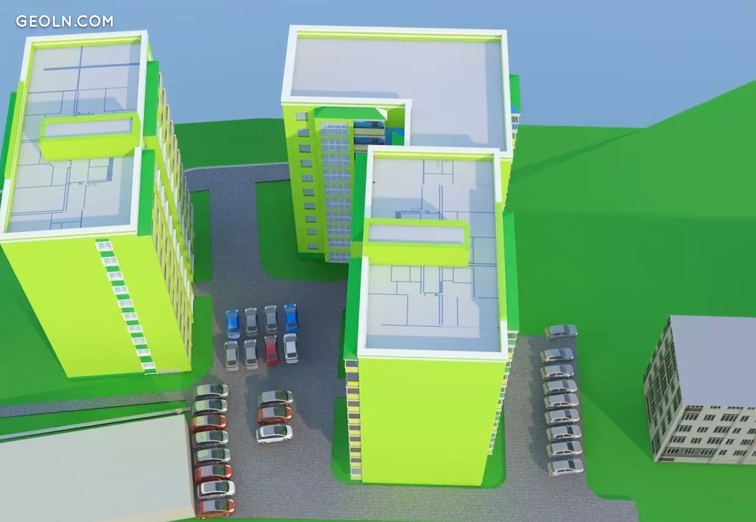 在新建筑的领土上,正在进行创建车道和人行道网络的工作。安排来宾车辆的地面停车位。设有儿童游乐场,舒适的休闲区,并分配了一个放置垃圾箱的地方。安装路灯,种植树木和灌木。