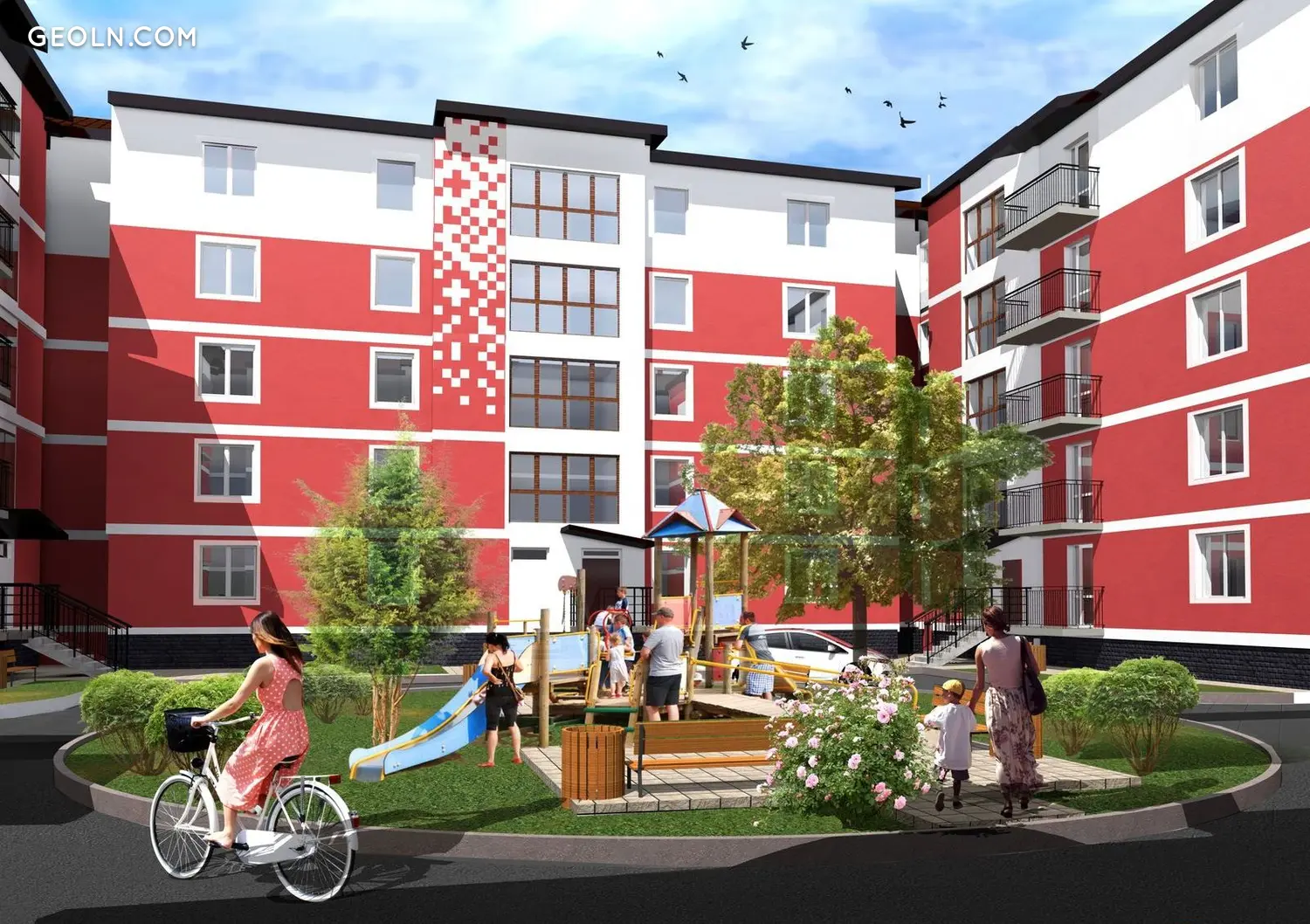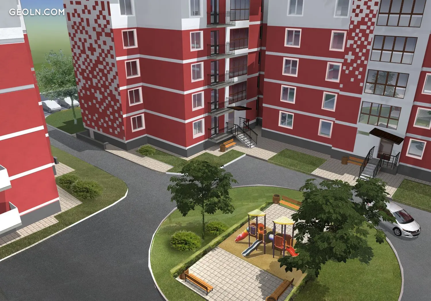 这些路段布置成一个封闭的院子,有一个汽车入口,必要时很容易控制。地面停车场位于外面,院子里设有儿童游乐场。