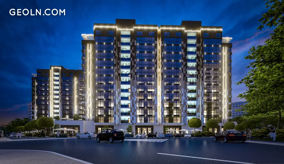 LCD Comfort City Rybinsk酒店由2个11层高的住宅区,2层停车场和一个带足球迷你场地的软地操场组成。