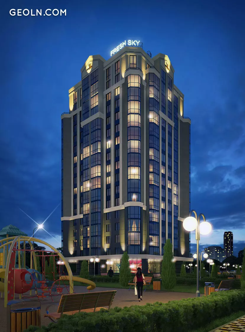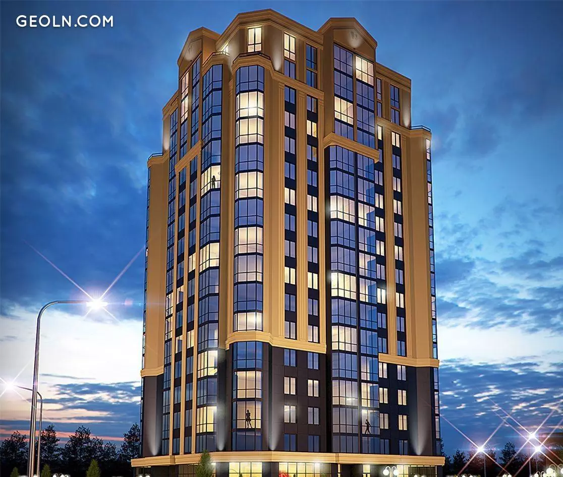 Sky住宅综合体是根据现代项目规划的,共有16层。整体式框架技术可在家里提供高强度,隔音和能源效率,并通过陶瓷砖和一层矿棉进行增强。