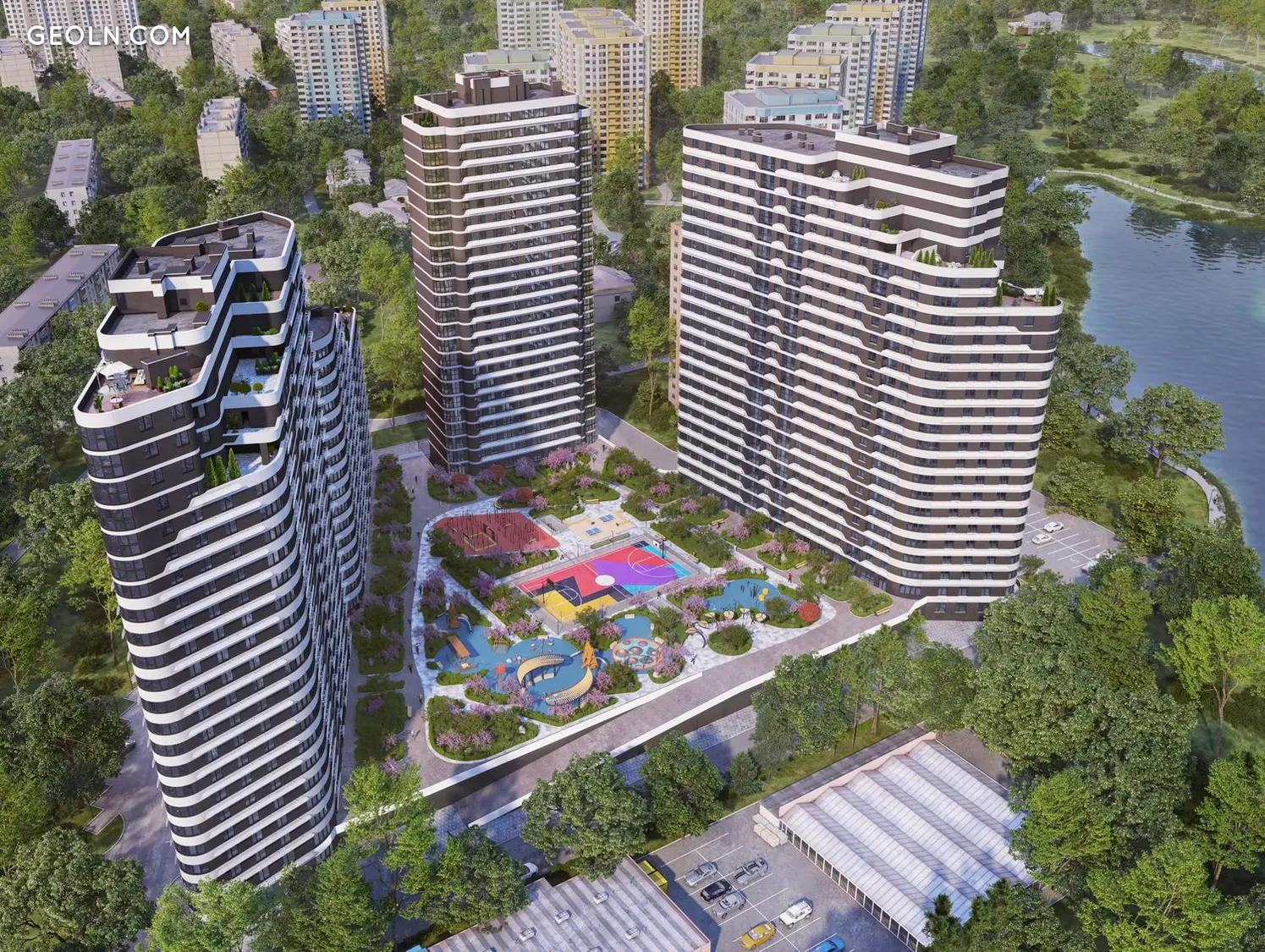 住宅区“Park Lakes”的名称与其靠近胜利公园和风景如画的池塘的位置有关。建筑物的建筑风格以其生物技术风格而著称,以圆形、现代设计和层叠的地板来表达,使实施非标准的规划解决方案成为可能。该项目的一个特点将是该地区的功能性垂直分区,在下层设计了可停放 296 辆车的地下停车场,顶部将是一个带景观、儿童游乐场、游乐场、休闲区和客用停车场的大院子.新大楼的底层是商业场所,将开设咖啡馆、商店、美容院、药房和其他必要设施,并将为综合大楼内的小孩子建造一个新的幼儿园。