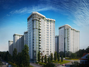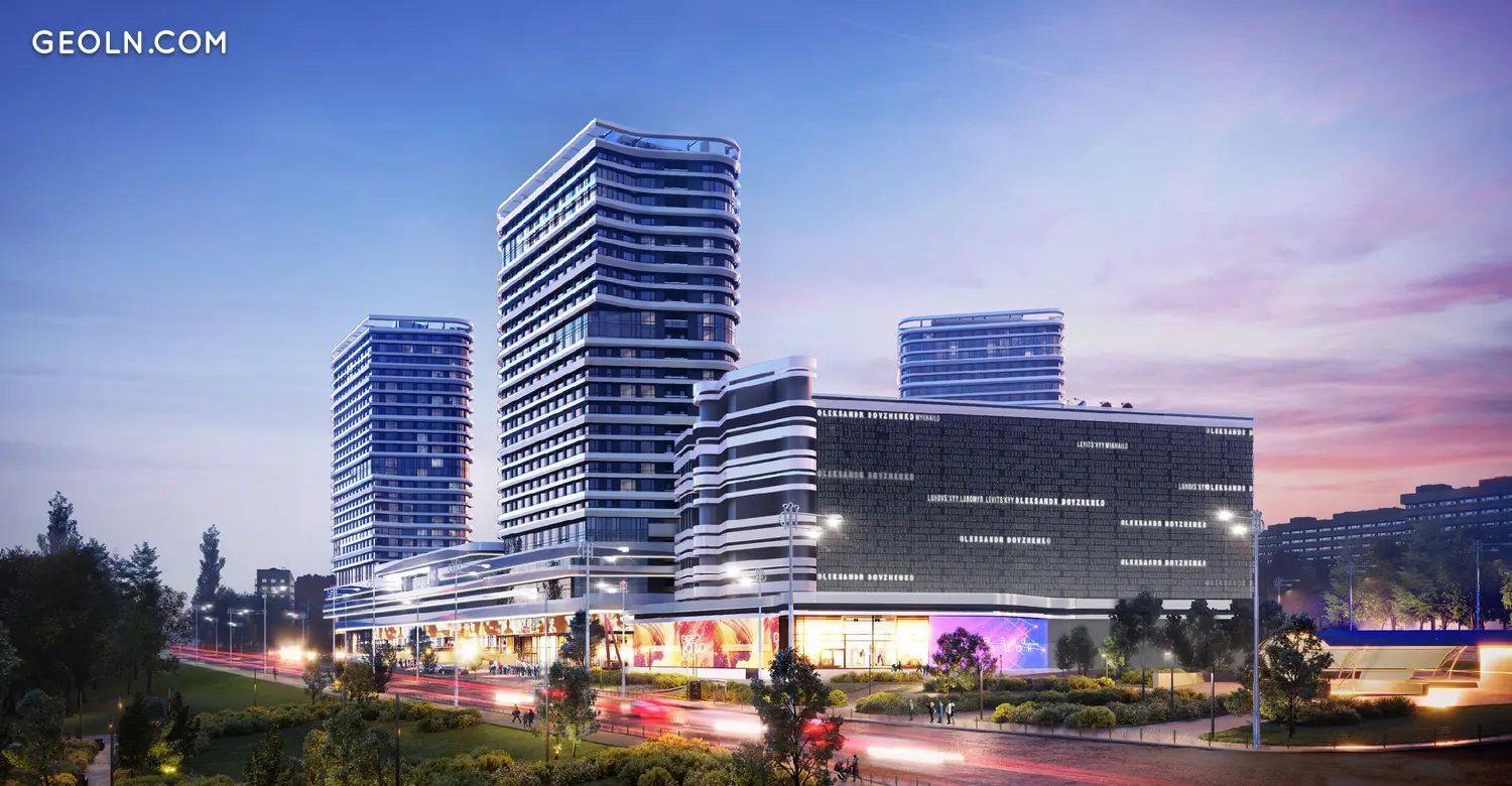 未来派建筑,白线和全景玻璃的对比 - 这是白线住宅区。三座白色塔楼将通过一个共同的柱状部分连接起来,其中将开设一个购物中心。购物区和住宅区将分开,因此购物中心的买家不会对综合体的居民造成不适。