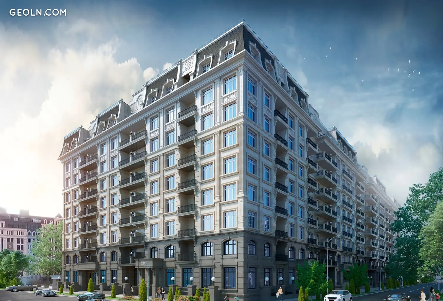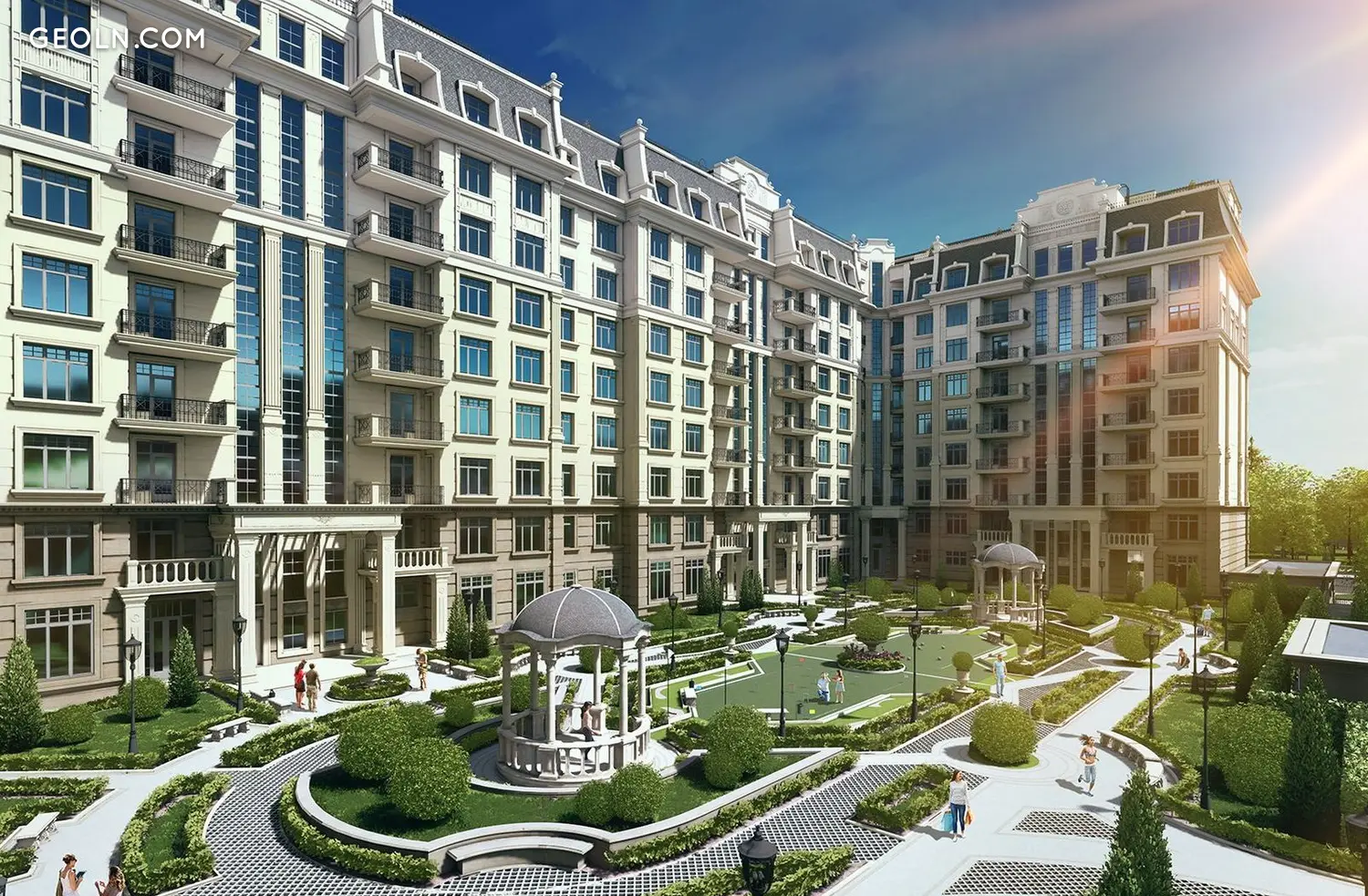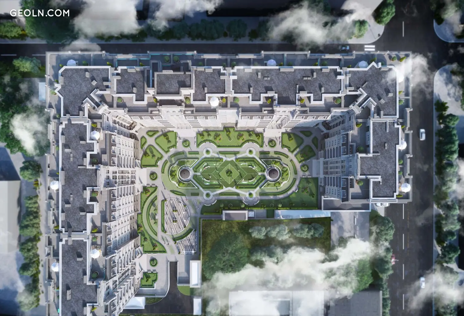 房屋景观的设计师重新营造了巴黎林荫大道的氛围,并设置了儿童游乐场、宠物散步区、迷你高尔夫和槌球游乐场。经典材料用于饰面:大理石、木材、瓷器和镀锌金属。