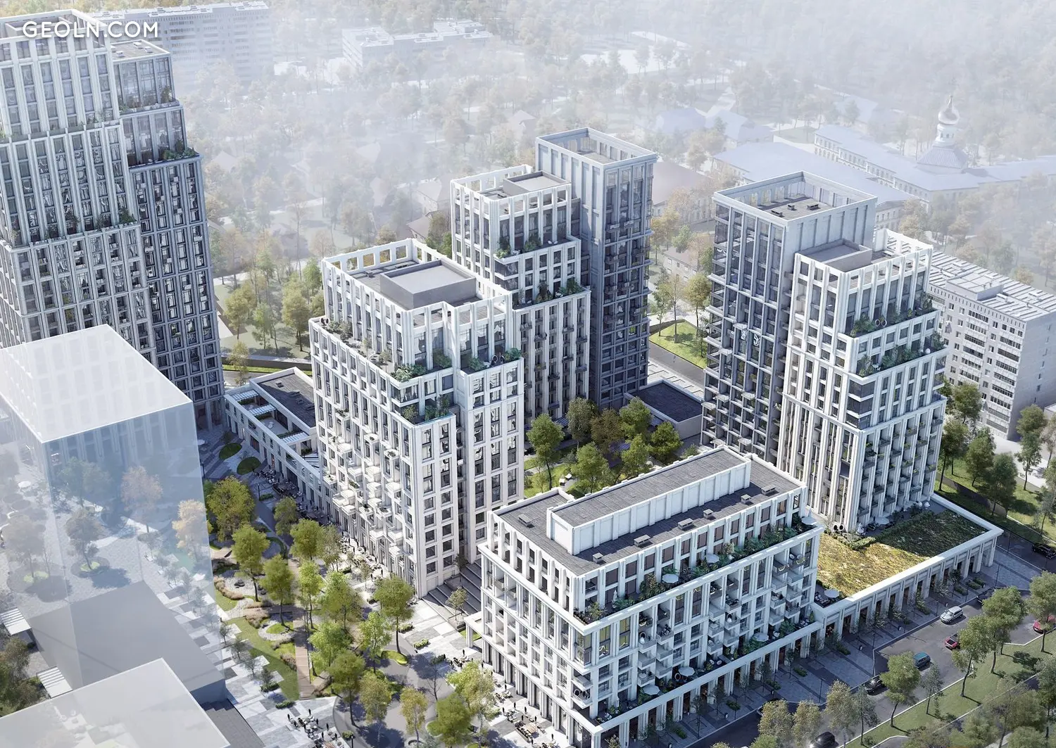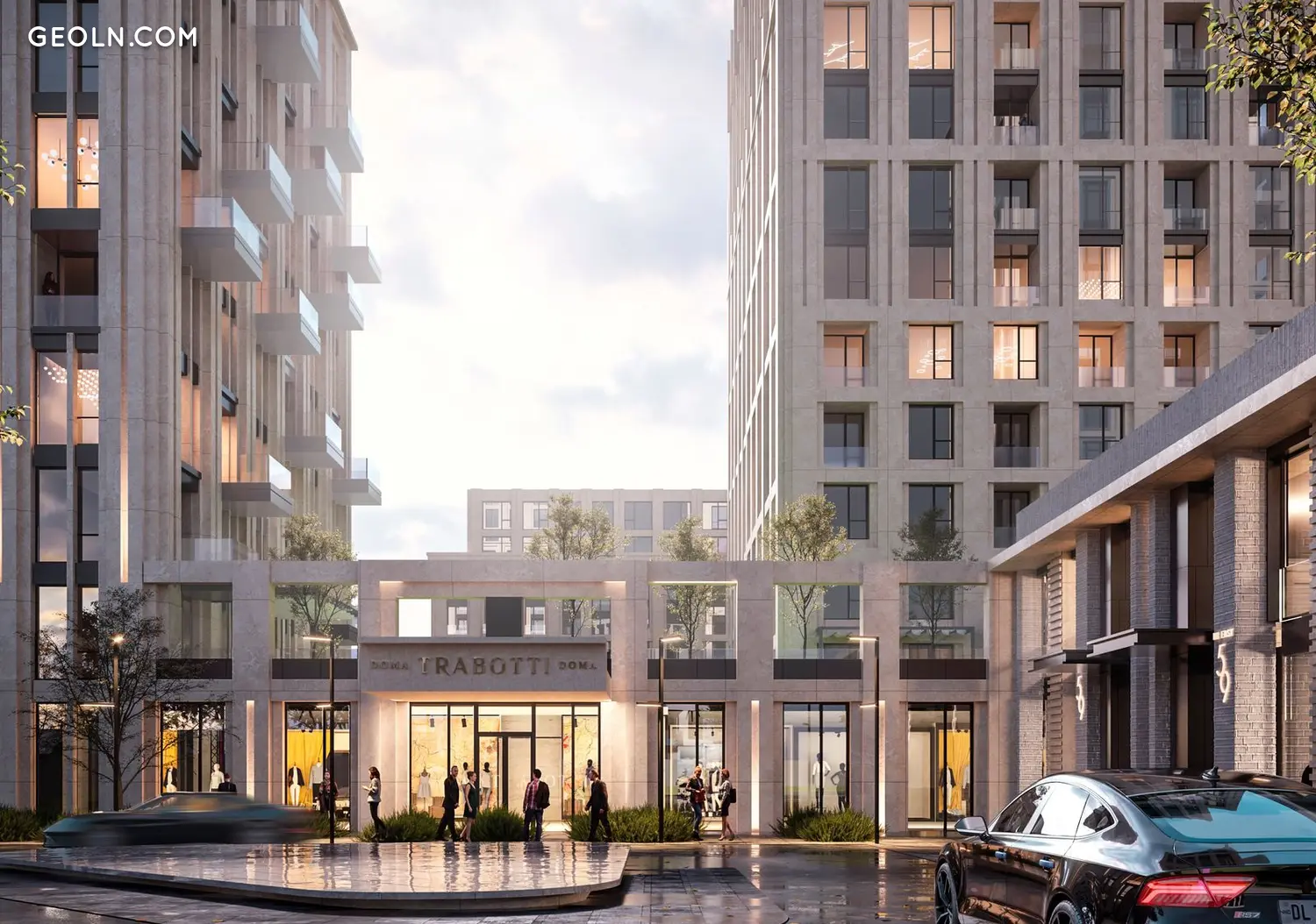 该项目规定建造 16 栋层叠式房屋。建筑的结构可谓“兼收并蓄,法式别致”——Doma Trabotti 巧妙地结合了过去几年的不同风格和现代主义美学。毗邻地区包括公园小巷、游乐场和运动区。自治基础设施将使未来的居民无需离开综合体就可以去杂货店、喝杯咖啡或安排购物。此外,该项目还提供自己的水疗中心、游泳池和休闲区。