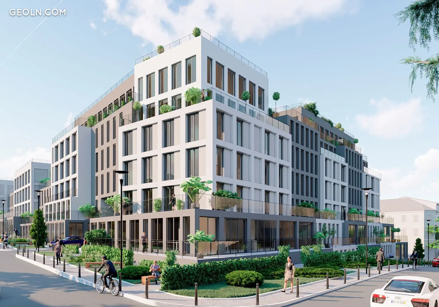 转角建筑形成了一个舒适的庭院,设有绿色座位区、儿童和运动场,宽敞的地下停车场将使庭院远离汽车。