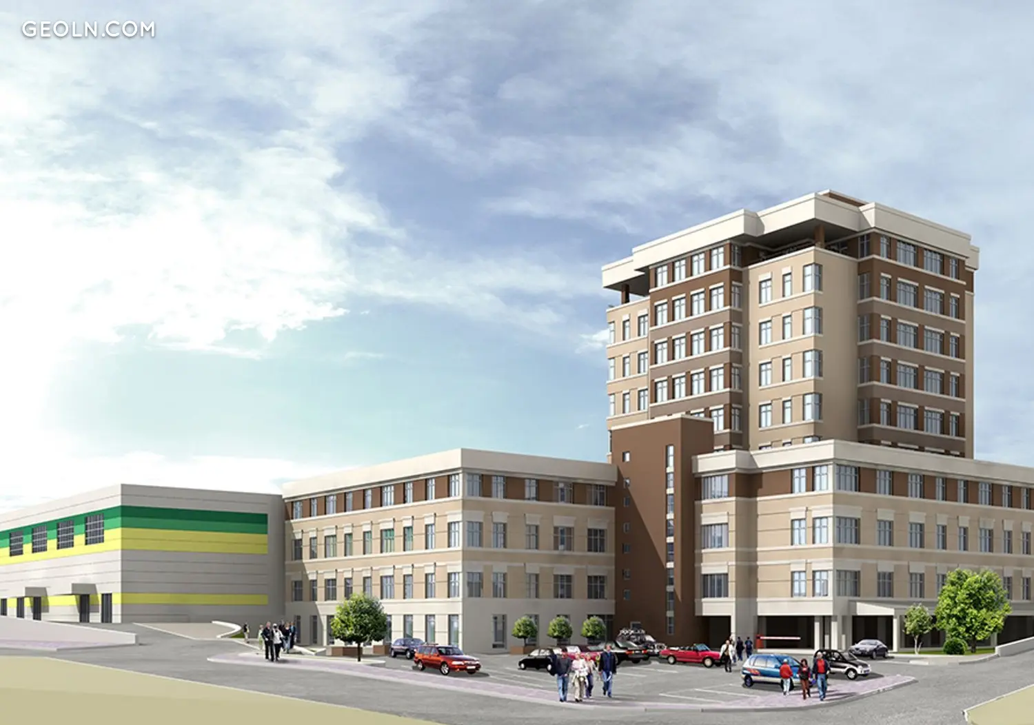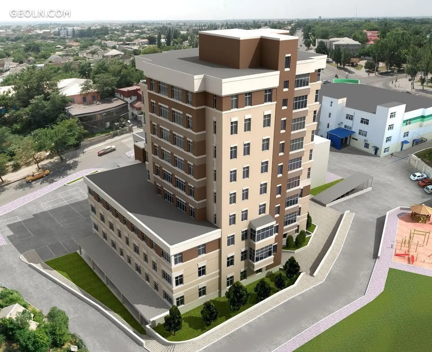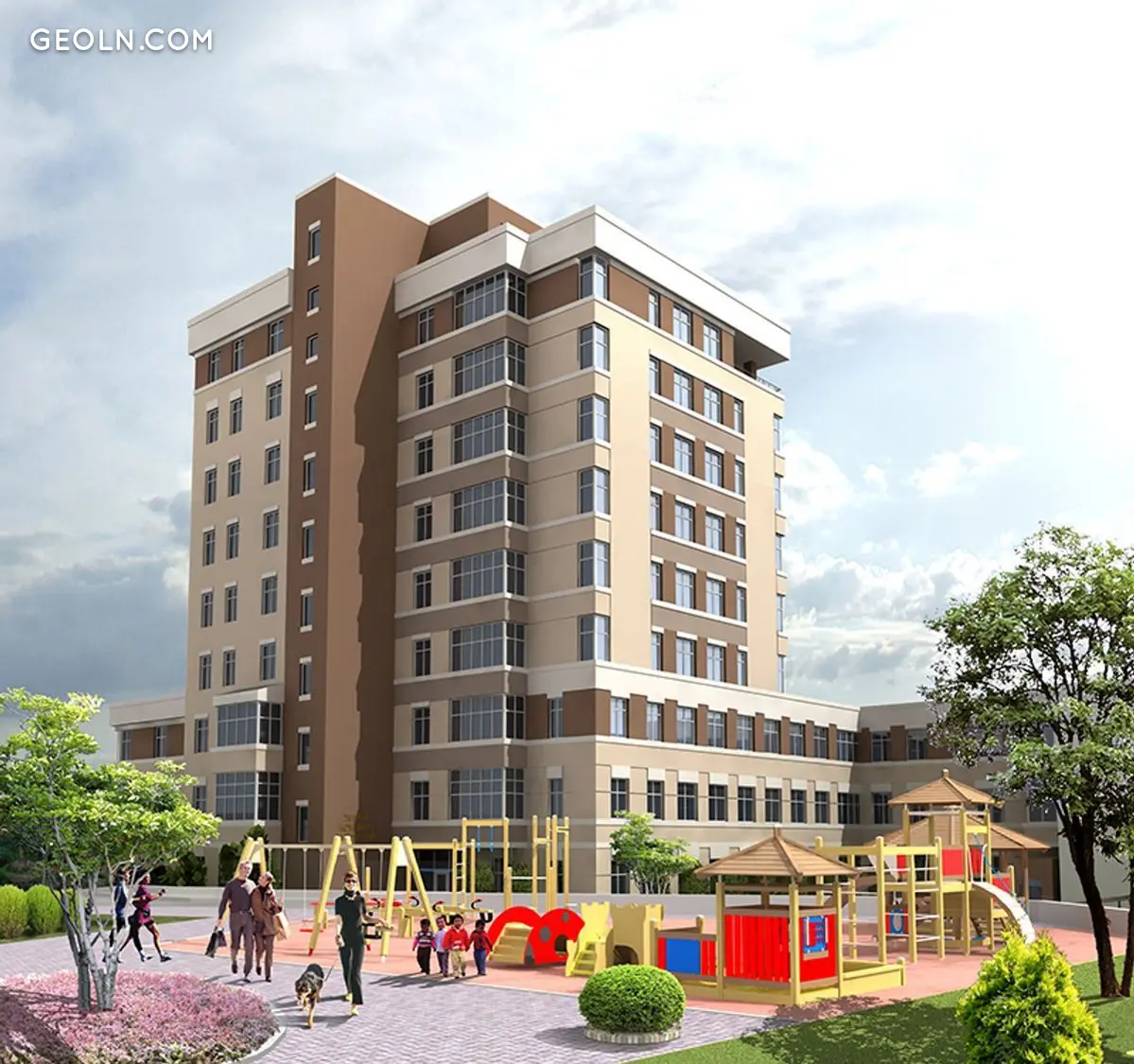 住宅区“基洛夫斯基”位于梅利托波尔的中心——通过房子的全景窗户和楼上的开放式露台,可以看到邻近的建筑物,公园。高尔基广场和胜利广场。为了避免市中心的单调建筑,建筑师使用了层叠的地板和米色棕色。带儿童和运动场的室内区域仅供综合大楼的居民及其客人使用。