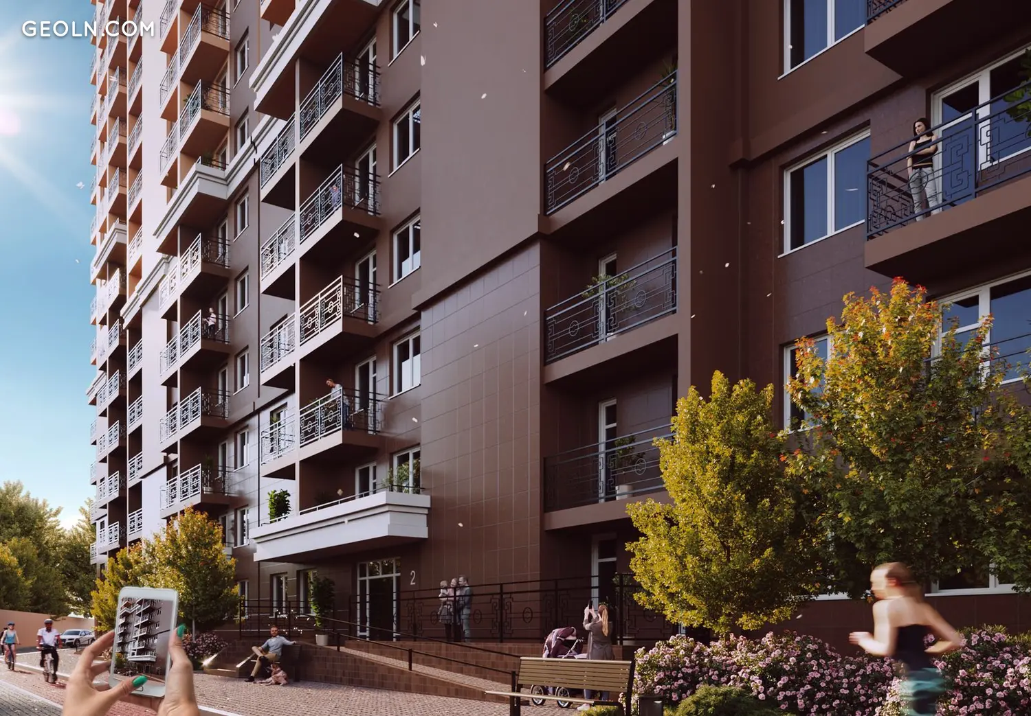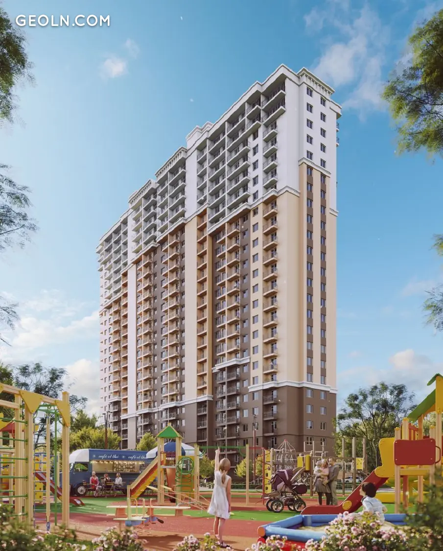 “五十一颗明珠” - 位于城市商业、金融和娱乐生活中心的商业级住宅区,同时靠近阿卡迪亚海滩。在邻近建筑群的背景下,新建筑的特点是米色棕色的外墙和开放式阳台的镂空围栏,可以欣赏到附近和城市的景色,以及在较高楼层 - 大海。