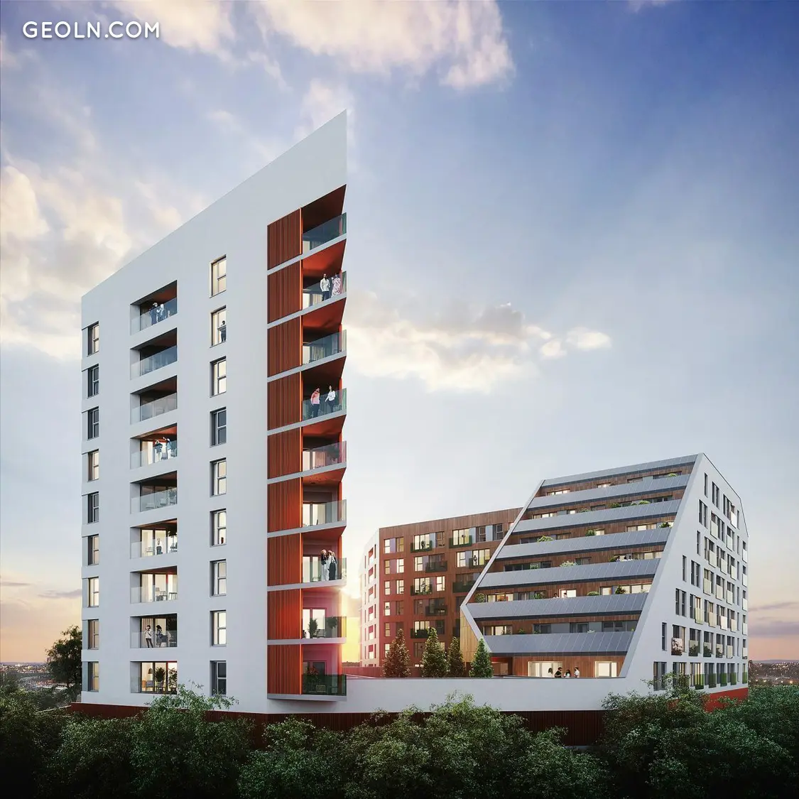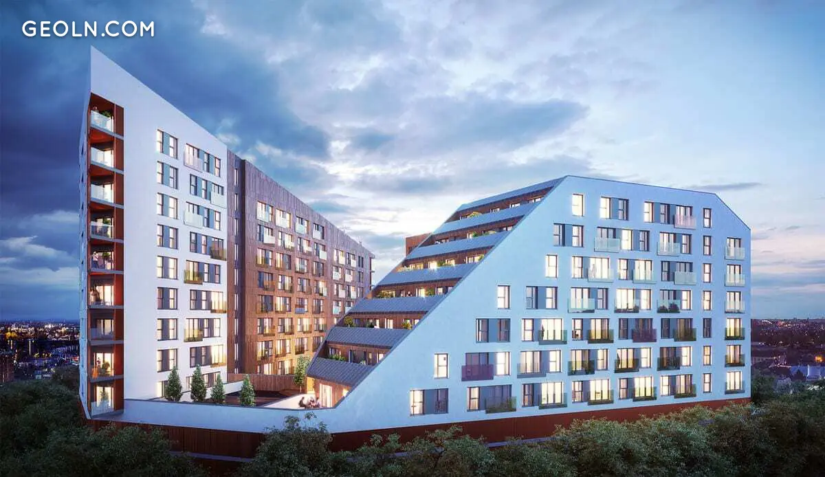 大交易所采用渐进式设计和独特的架构,吸引了路人的眼球。住宅小区由2栋建筑组成,高度从7层到9层不等。这些物体的一侧有一个不寻常的尖头形状,从建筑物的另一部分平稳下降。一部分外墙漆成白色,另一部分则用棕色瓷砖完成。在住宅区的尖角,有带透明栏杆的阳台。 Grand Exchange 有一个平屋顶和许多落地窗。