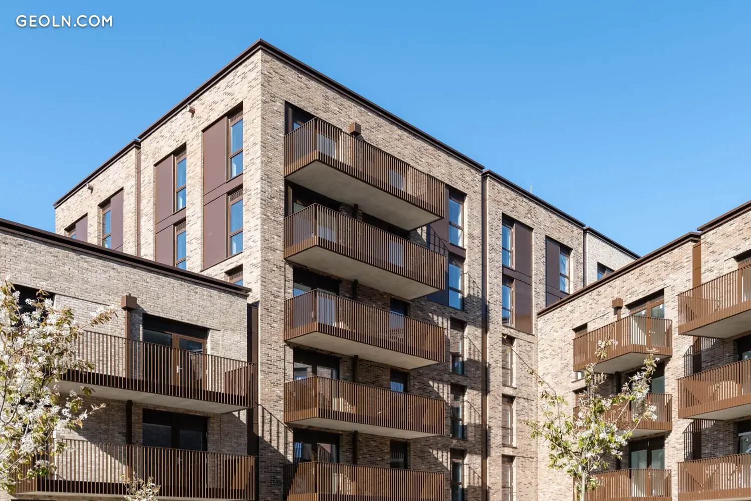 U形中层开发项目以两翼面向运河,保护中央庭院免受熙熙攘攘的街道的影响。自由码头拥有浅色砖砌外墙和一系列方柱。该建筑点缀着大型全高窗户和宽敞的悬臂阳台,装饰有简单的直线栏杆和青铜细节。