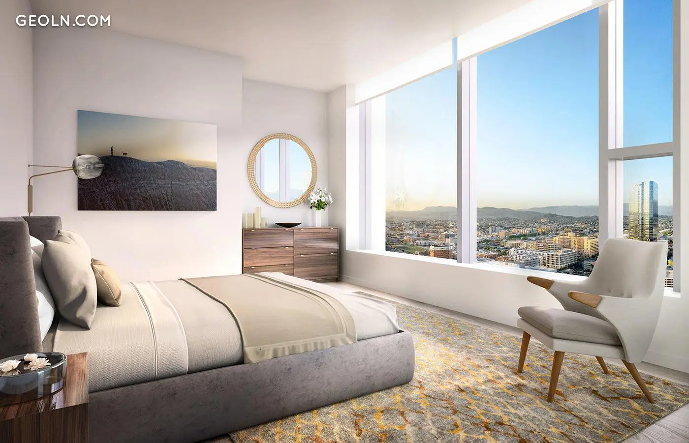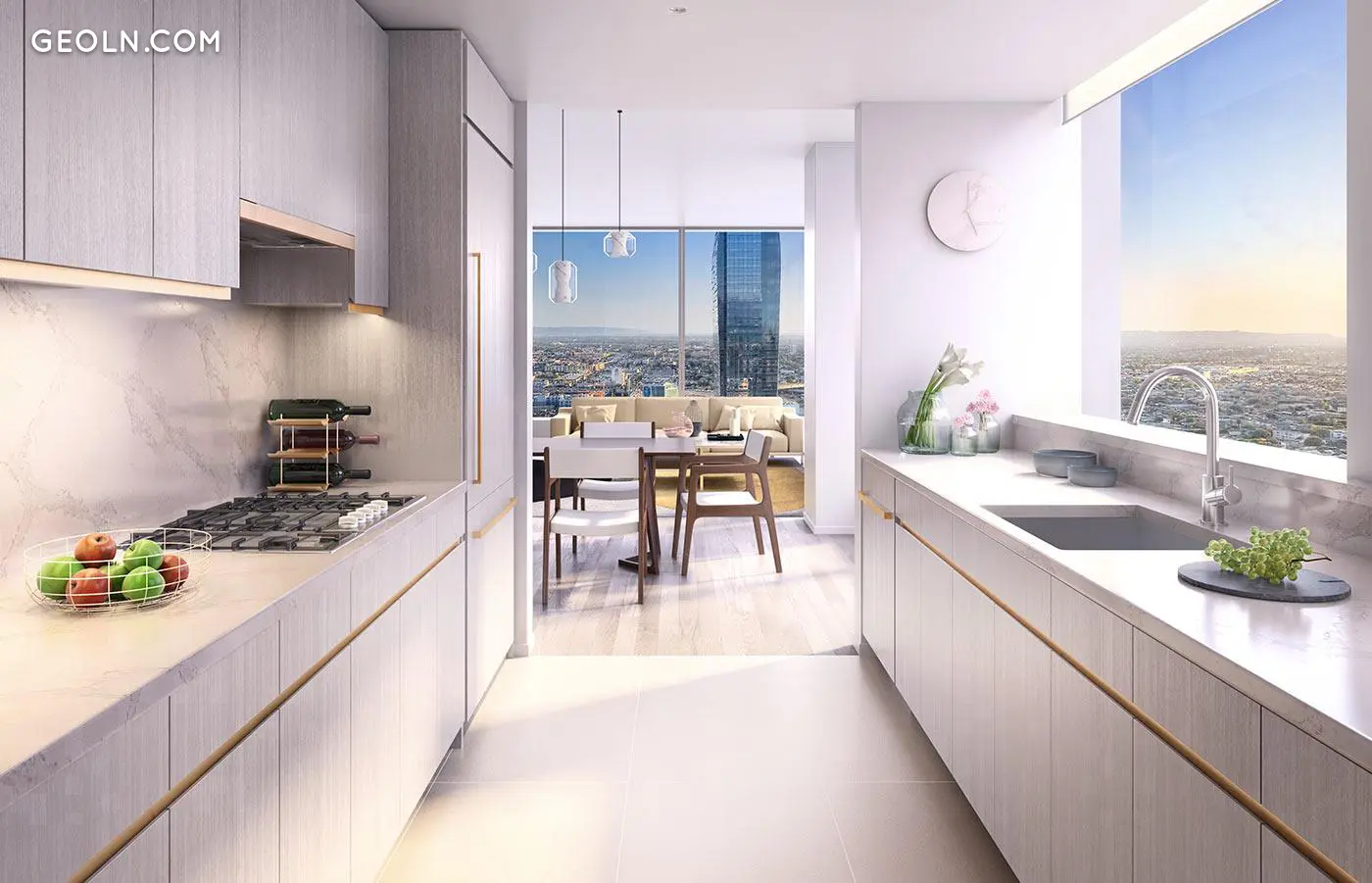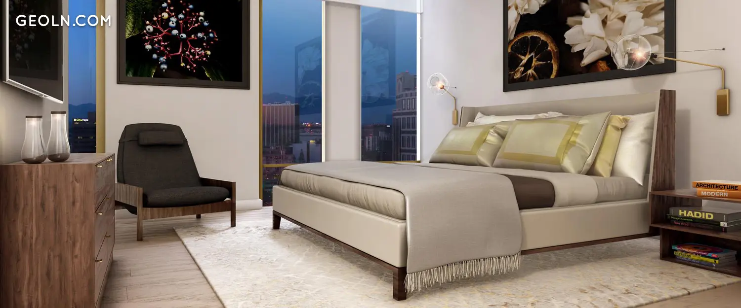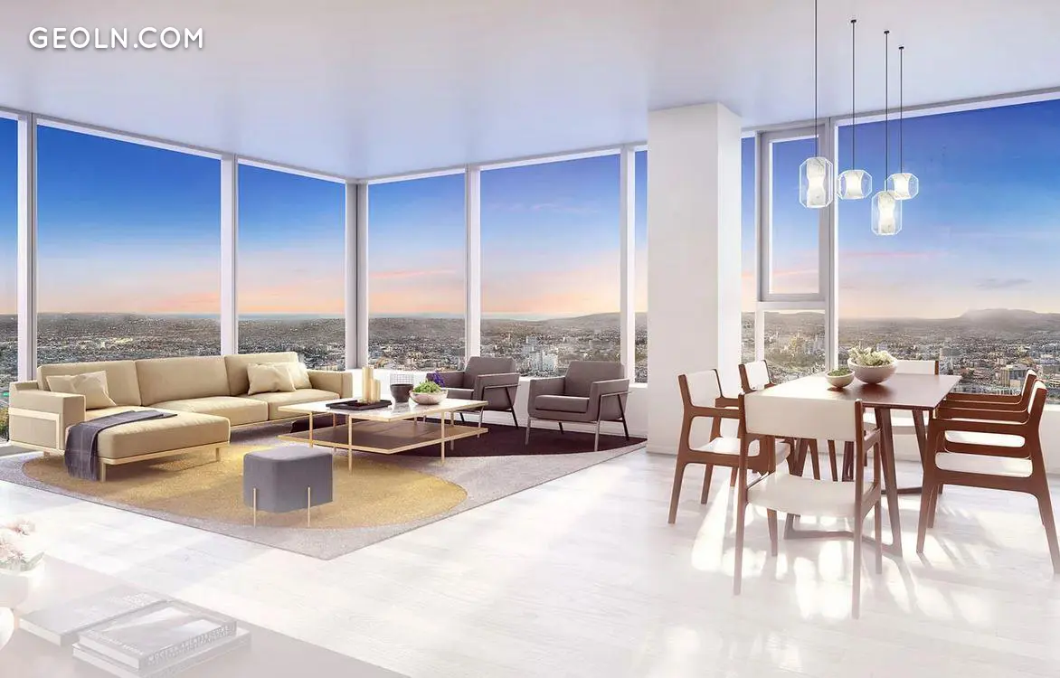 一卧室房屋拥有宽敞的大房间,主卧室设有类似SPA的套间浴室和一个半浴缸。 所有两居室住宅均为角落住宅,可欣赏洛杉矶和好莱坞山的多向,西南和西北景观。