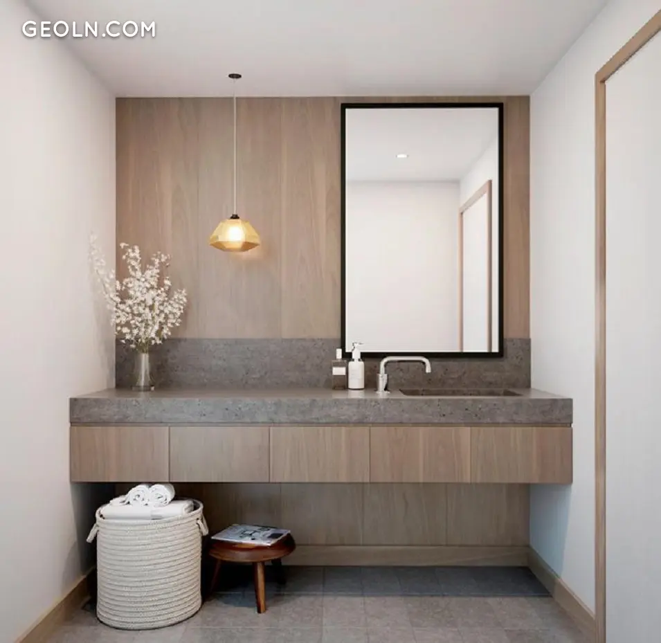 定制化妆间墙,配配化妆室中配套的漂白胡桃木抽屉