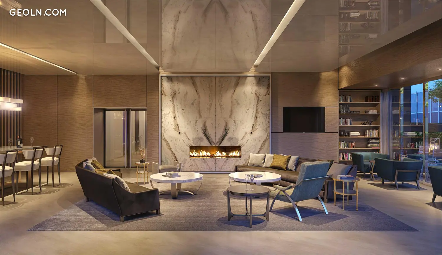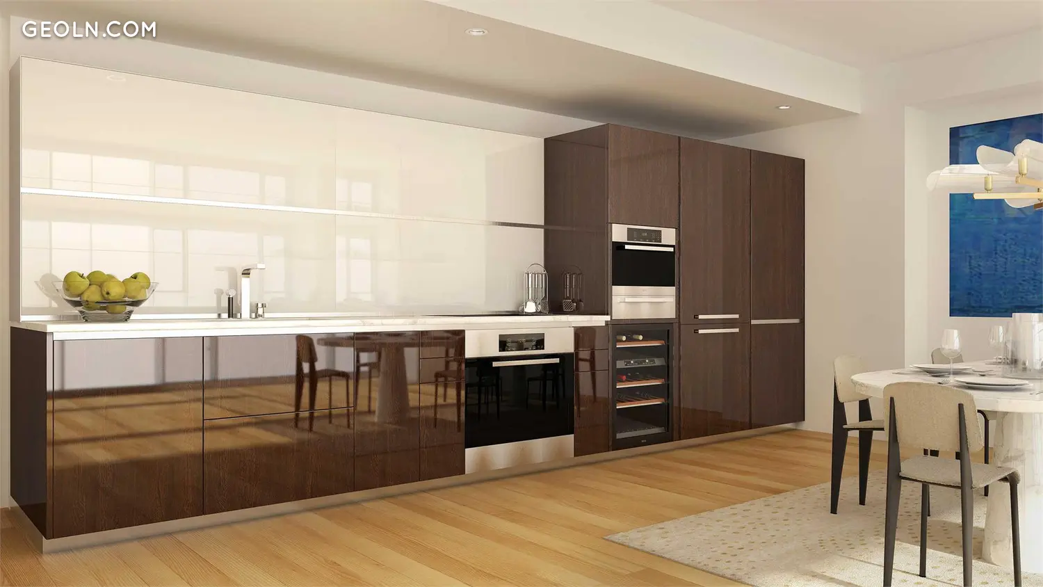 定制厨房经过无缝设计,巧妙地将顶级Miele电器隐藏在Dada定制的彩绘玻璃和胡桃木橱柜后面。台面是优雅的Calacatta Vision抛光大理石,再加上青铜色缎面镜面后挡板和抛光镍Dornbracht配件。精选住宅包括高光白漆岛,上面铺有抛光的Calacatta Vision大理石。