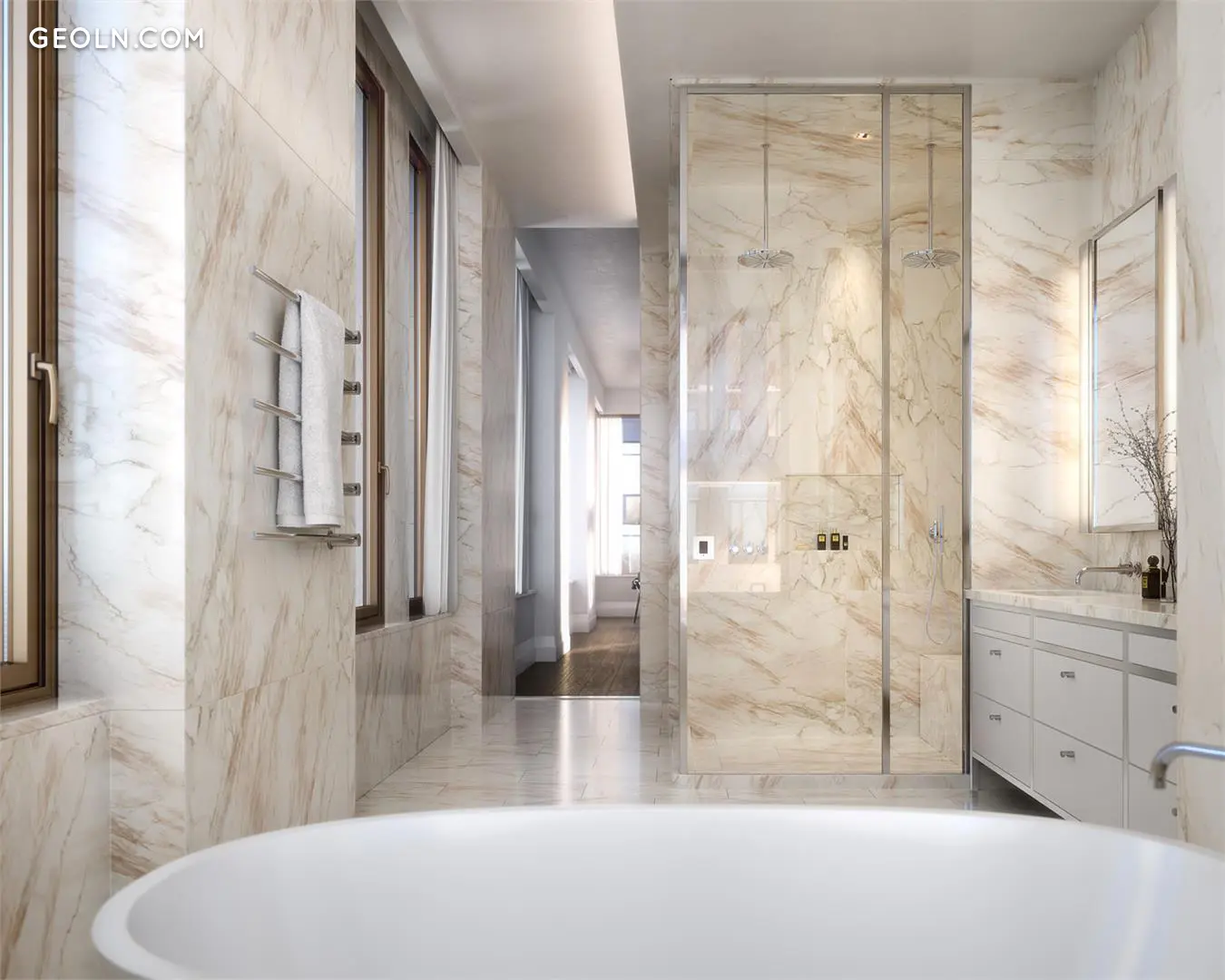 浴室铺在地板到天花板的磨光全板阿里斯顿大理石表面,加热地板中,并在整个房间内都采用了Vola五金。