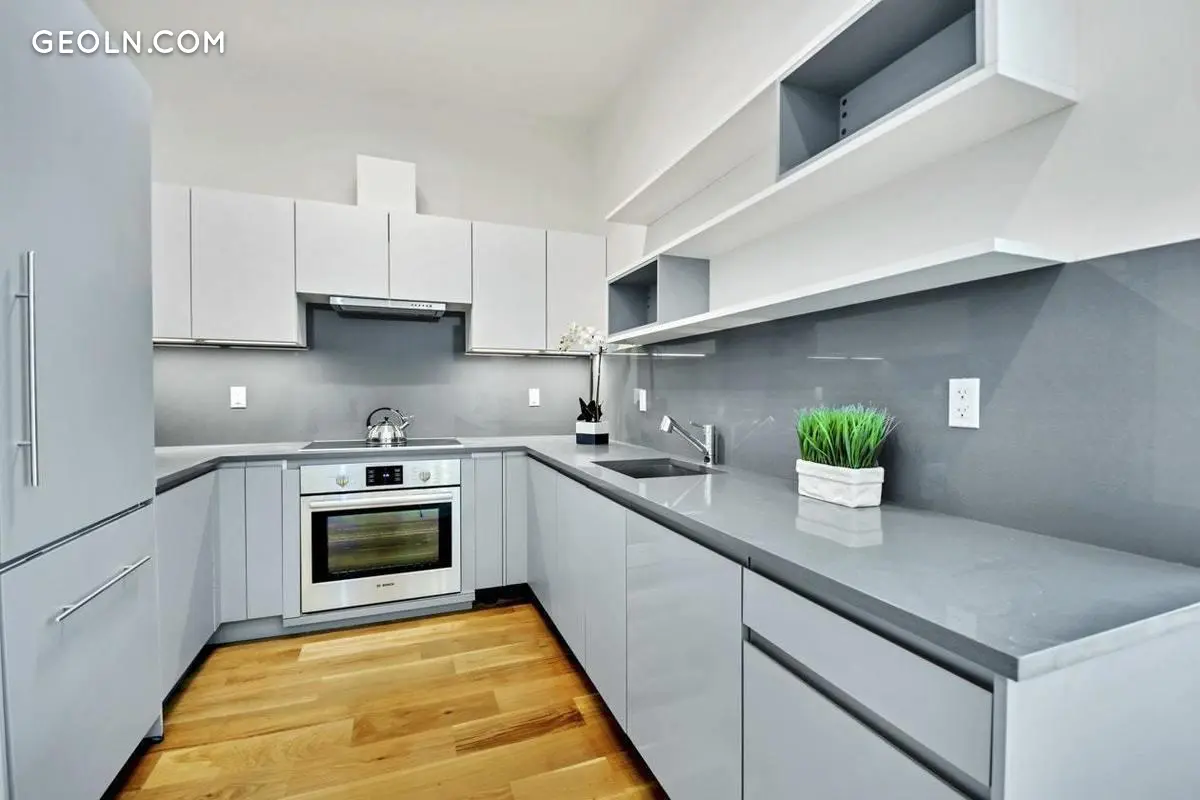 在整个建筑中,经过精心设计的厨房都配有博世电器套件,其中包括软封闭的灰色和白色光泽柜以及Blanco的不锈钢硬件。台面和后挡板是生混凝土中的耐用石英。定制货架意味着可以利用每个墙和角落。